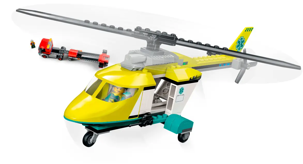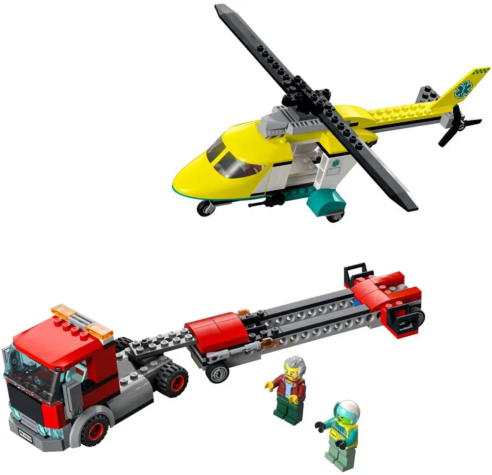 - в наборе все необходимое для сборки игрушечного грузовика с платформой-прицепом на шарнире и спасательного вертолёта, а также минифигурки водителя и пилота;