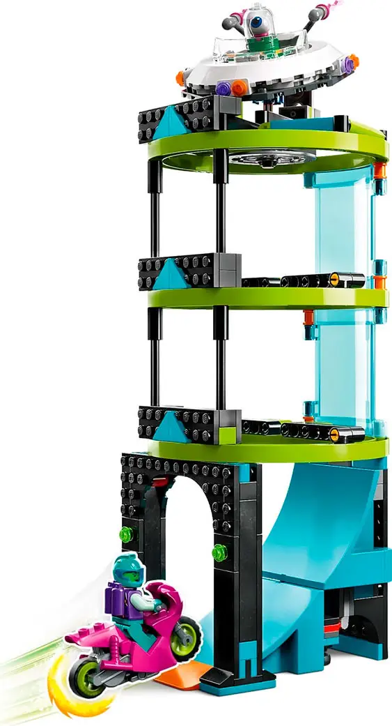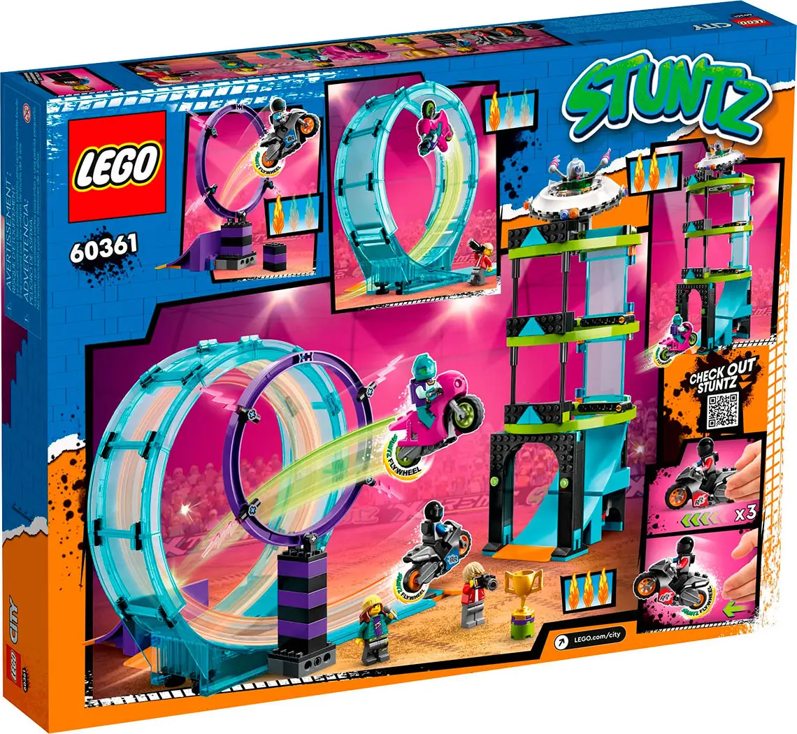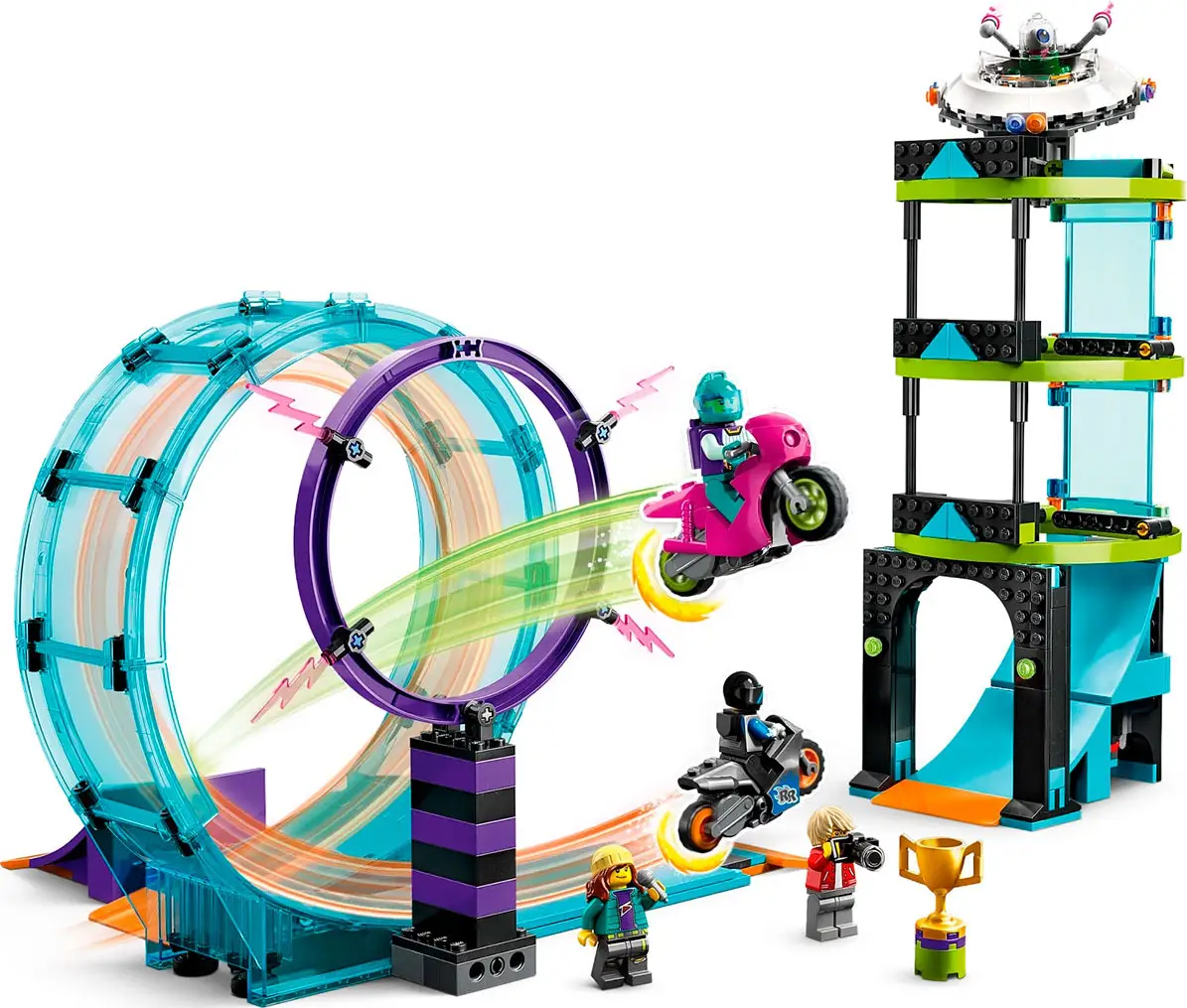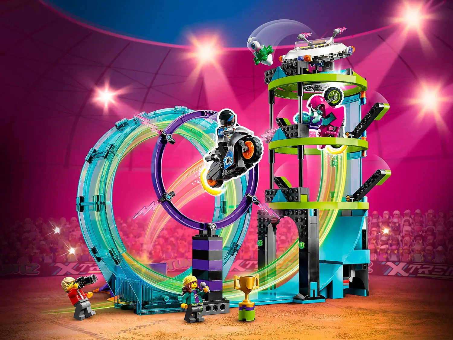 Набор Lego City «Главное каскадерское испытание» включает в себя 2 игрушечных трюковых мотоцикла и 3 комбинируемых трюковых устройства, в том числе 360-градусную петлю, огненное кольцо и забавную задачу «Башня пришельцев». Дети могут проверить свои навыки, устроить грандиозное шоу и посоревноваться с друзьями и семьей, чтобы получить кубок победителя.
