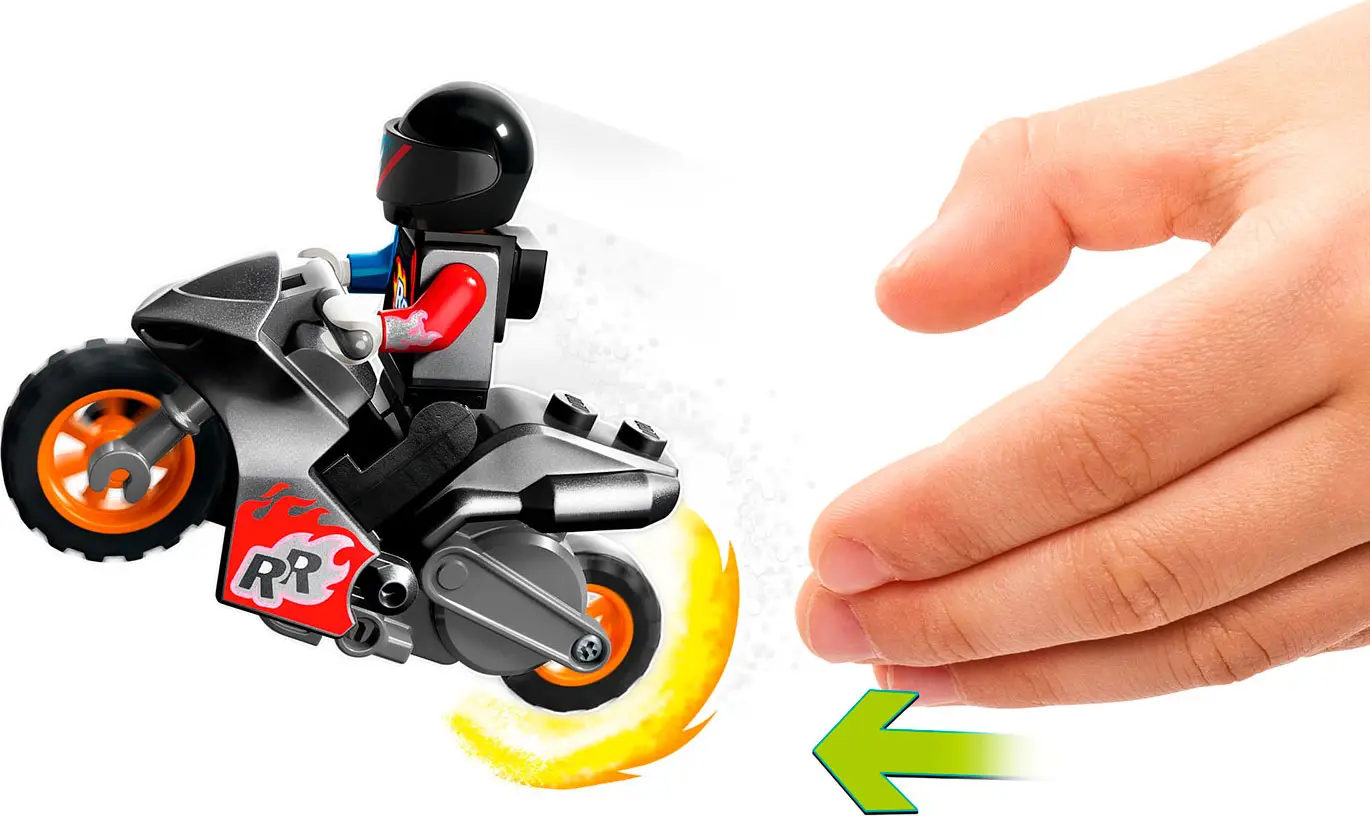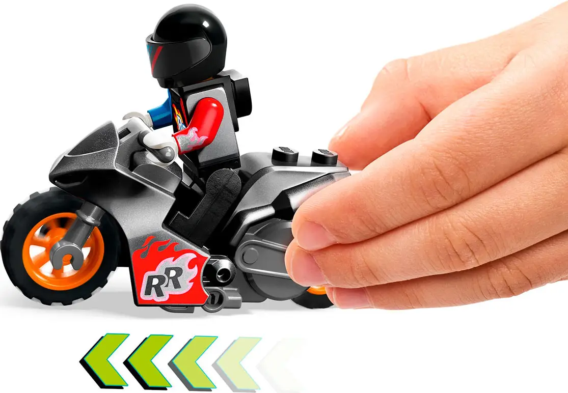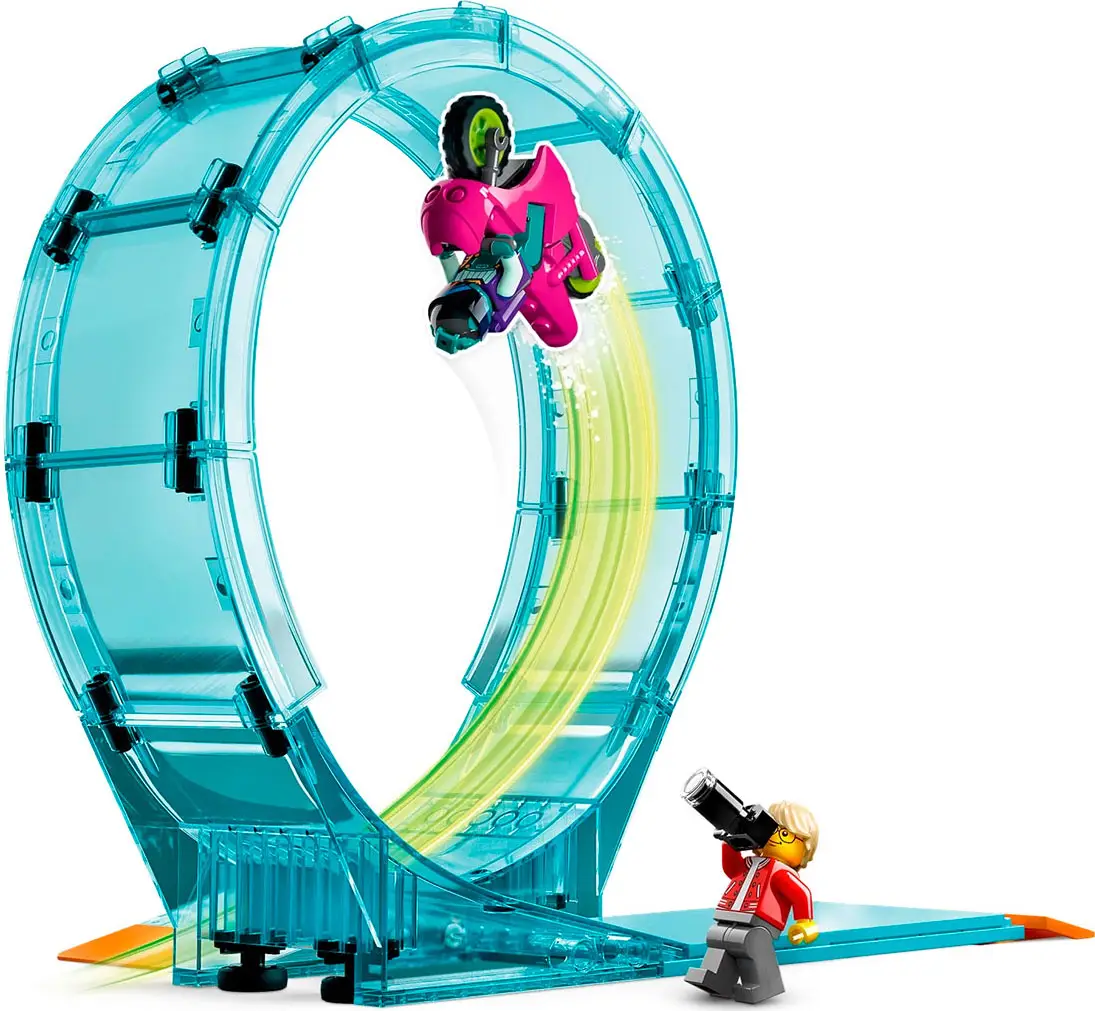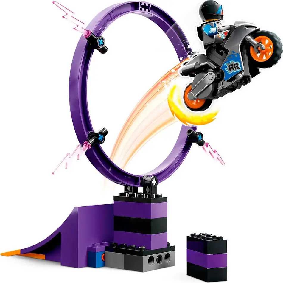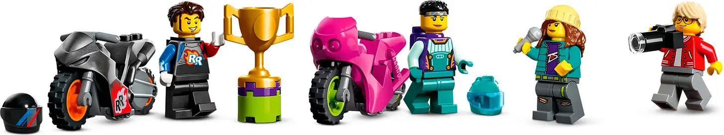 Набор Lego City «Главное каскадерское испытание» включает в себя 2 игрушечных трюковых мотоцикла и 3 комбинируемых трюковых устройства, в том числе 360-градусную петлю, огненное кольцо и забавную задачу «Башня пришельцев». Дети могут проверить свои навыки, устроить грандиозное шоу и посоревноваться с друзьями и семьей, чтобы получить кубок победителя.
