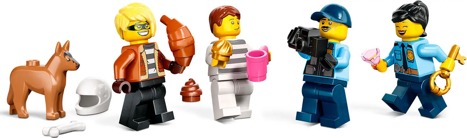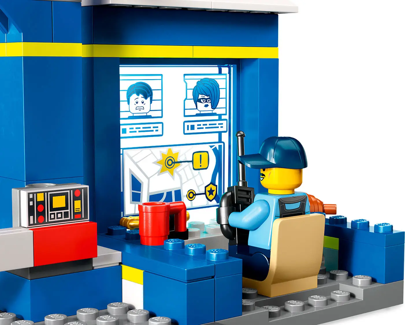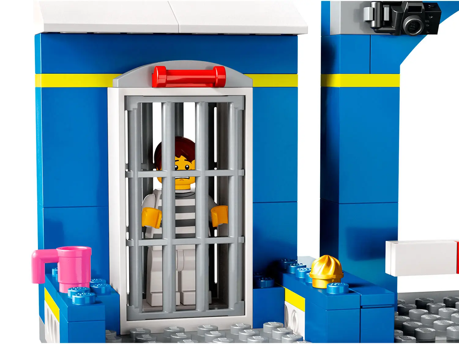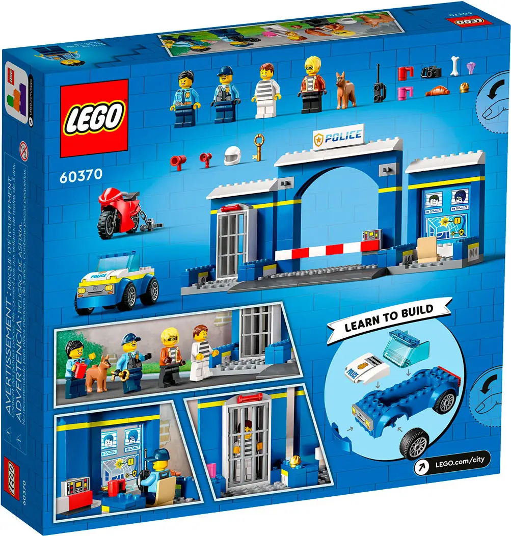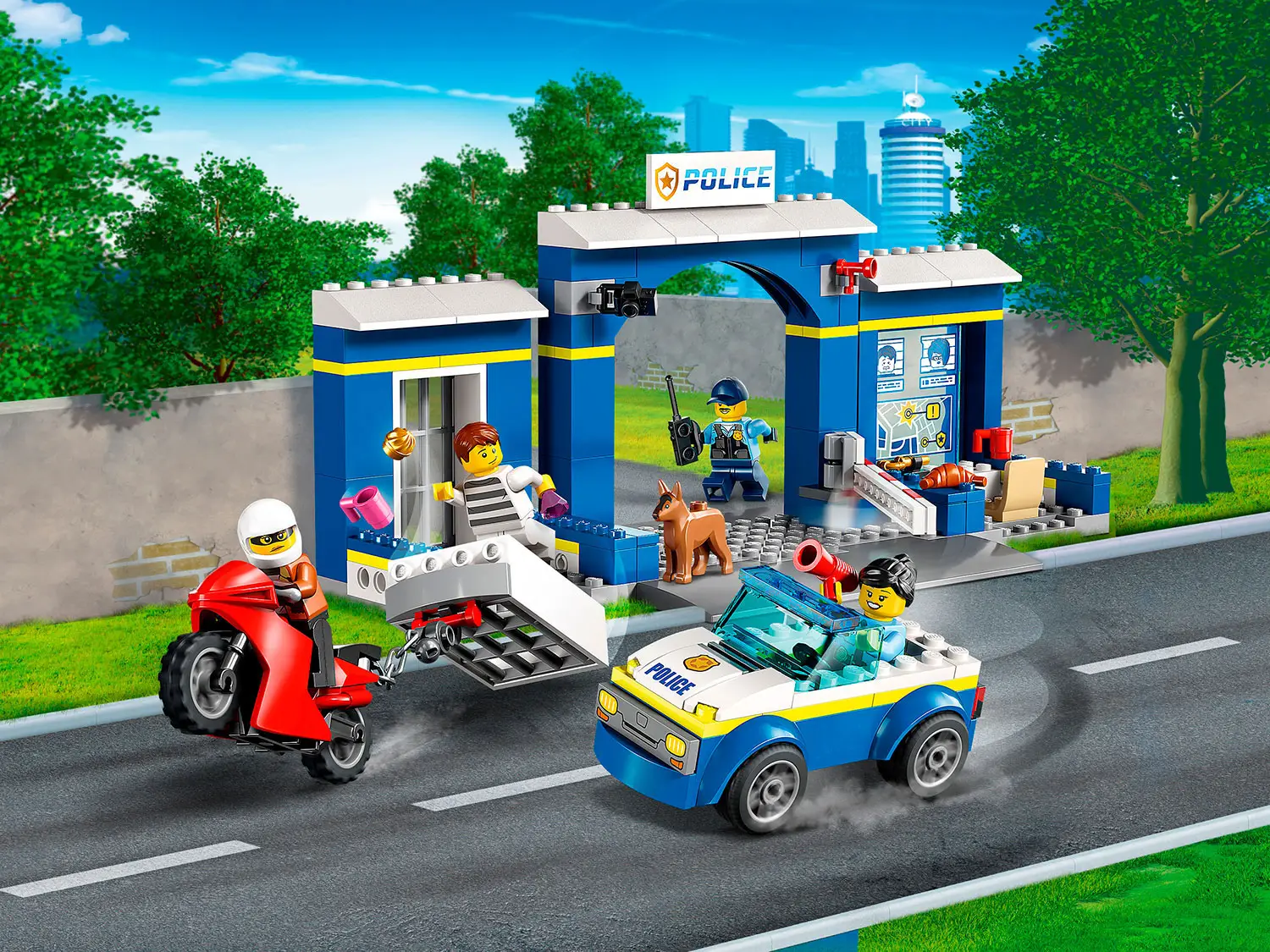 Набор Lego City «Побег из полицейского участка» включает в себя здание станции, которое оборудовано поднимающимся шлагбаумом, в нём есть офис и тюрьма, из которой можно сбежать. В этот набор также входят полицейская машина и мотоцикл, на котором могут убежать мошенники, а также минифигурки 2-х полицейских и 2-х мошенников.