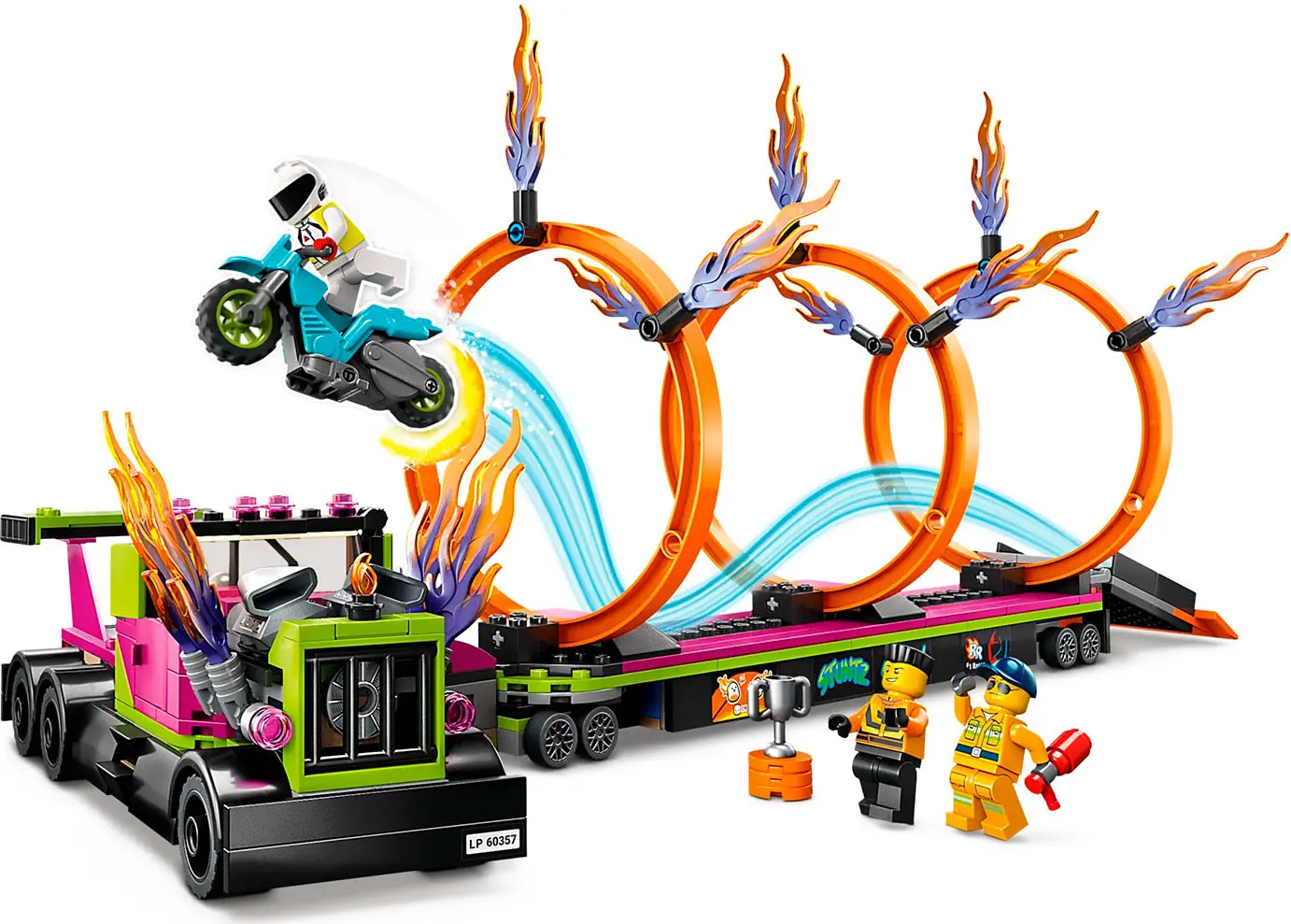 Набор Lego City «Трюковый грузовик и огненное кольцо» включает в себя крутой грузовик с огненными выхлопными трубами и прицеп с откидной ра...