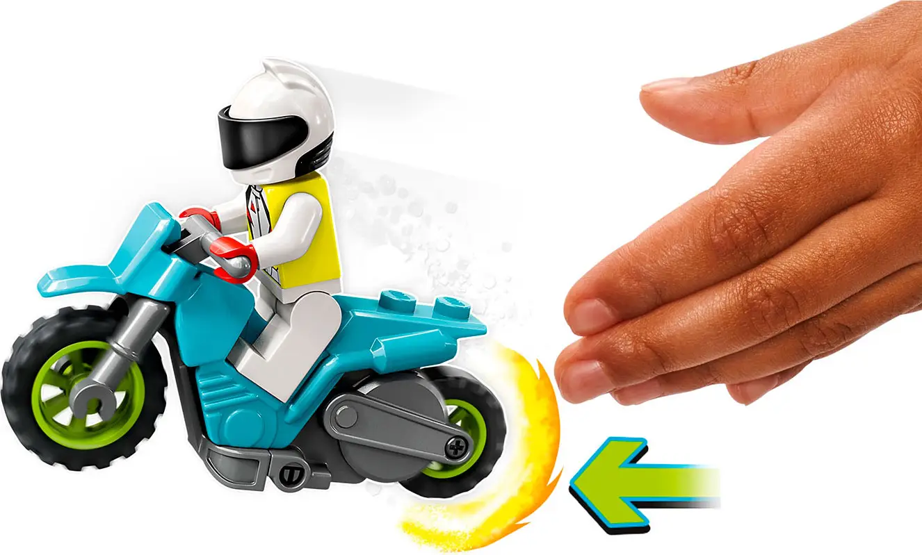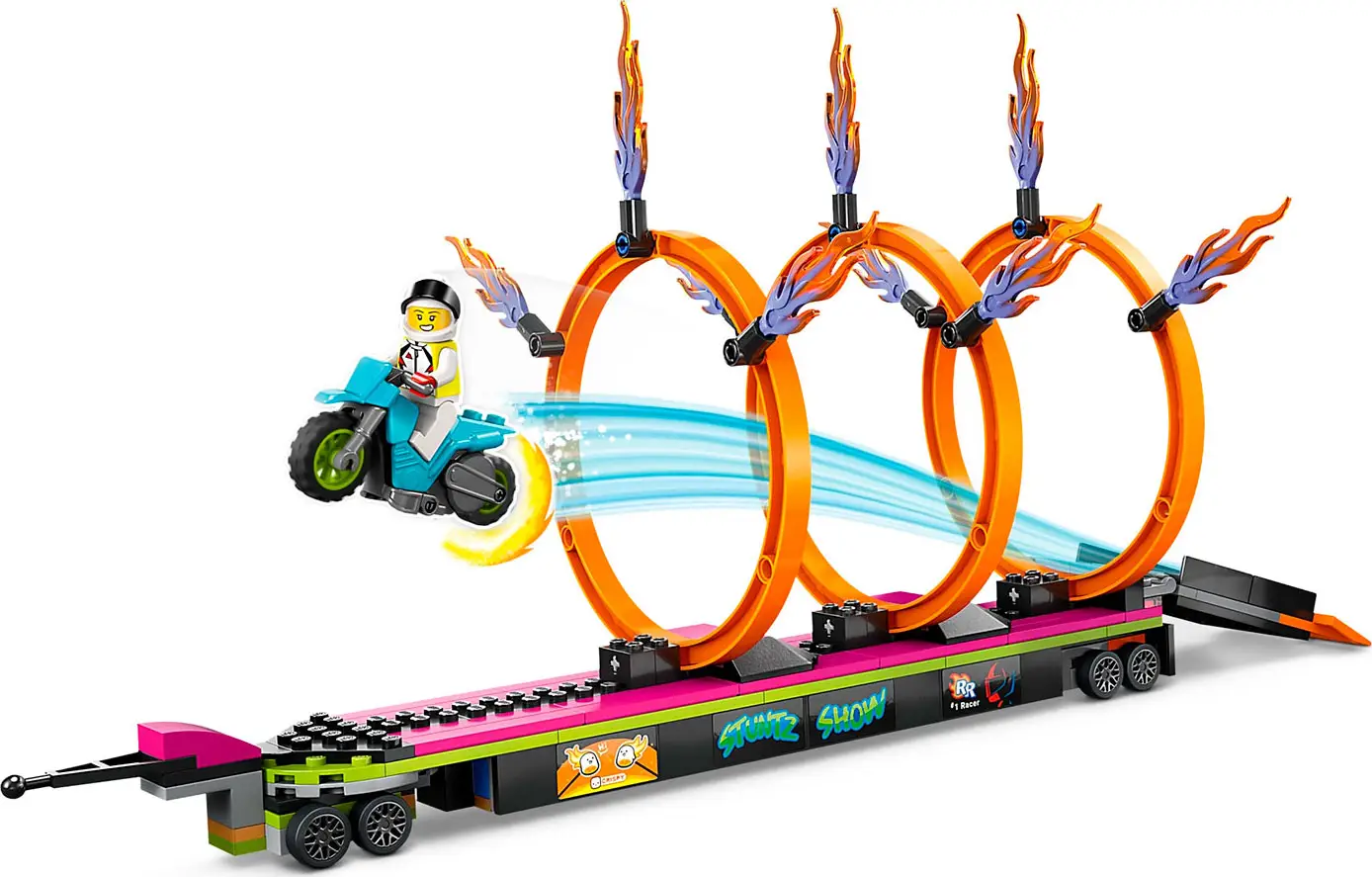 Набор Lego City «Трюковый грузовик и огненное кольцо» включает в себя крутой грузовик с огненными выхлопными трубами и прицеп с откидной рампой и 3-мя регулируемыми огненными кольцами. Плюс каскадерский мотоцикл с приводом от маховика, водитель грузовика и 2 минифигурки каскадерских гонщиков