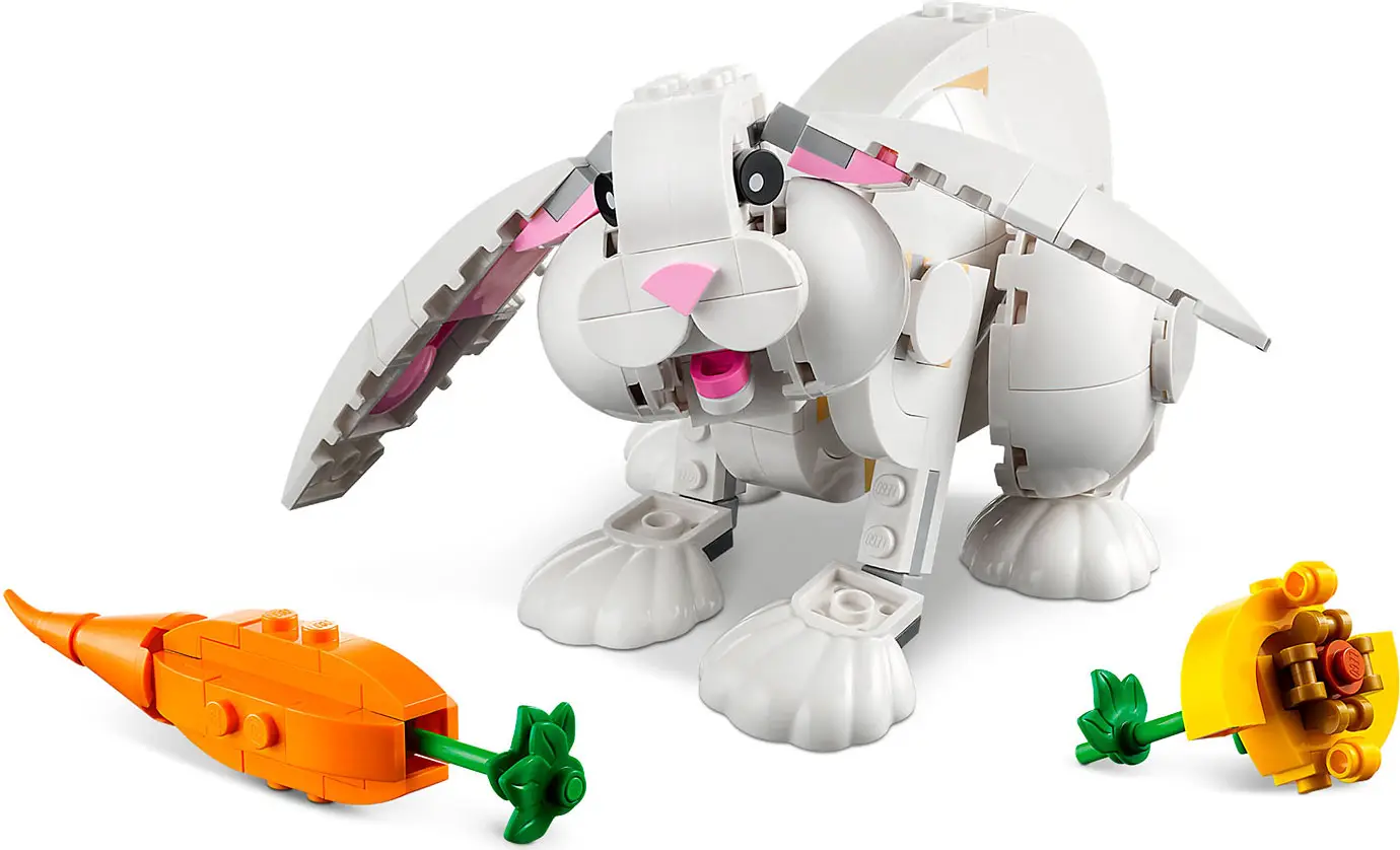 Конструктор Белый кролик Lego Creator 3 в 1 представляет собой игрушечного кролика из кубиков с подвижной головой, лапками, ртом и ушами, а также с 2 перекусами на выбор.