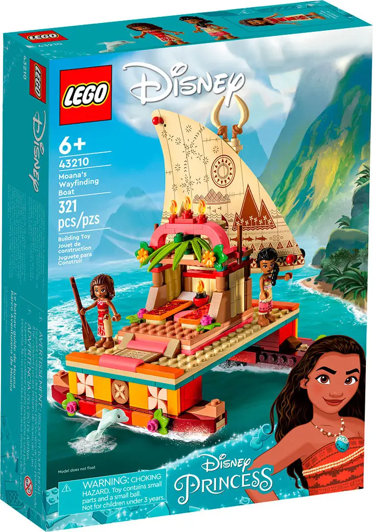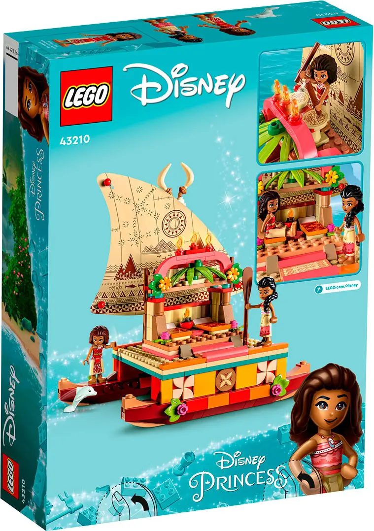 С набором Lego Disney Princess ребёнка ждут приключения с Моаной. В набор входит двухкорпусная лодка со съемным навесом и печатным парусом, место для хранения, 2 фигурки мини-куколок Lego, фигурка дельфина Lego и декоративные элементы.