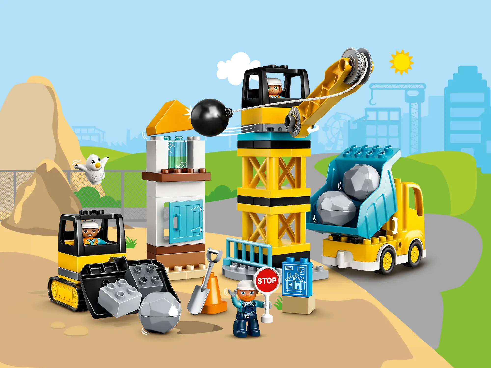Кран, грузовик и бульдозер для разыгрывания увлекательных историй на строительной площадке от Lego Duplo.