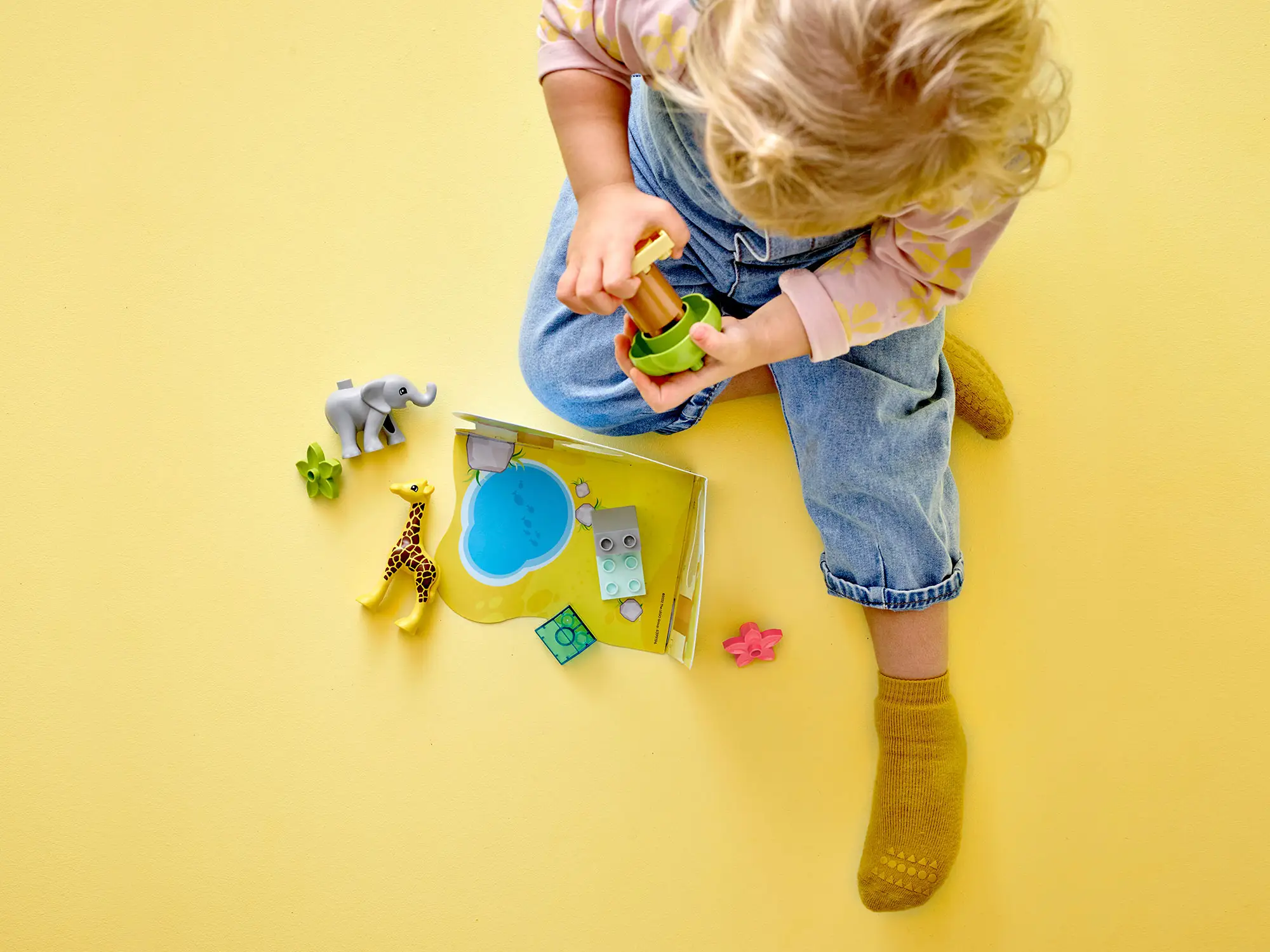 - в красочном игровом наборе есть слонёнок и жираф, которых малыши легко могут взять и поставить на место, а также цветы, дерево и трёхмерный игровой коврик с лесом;