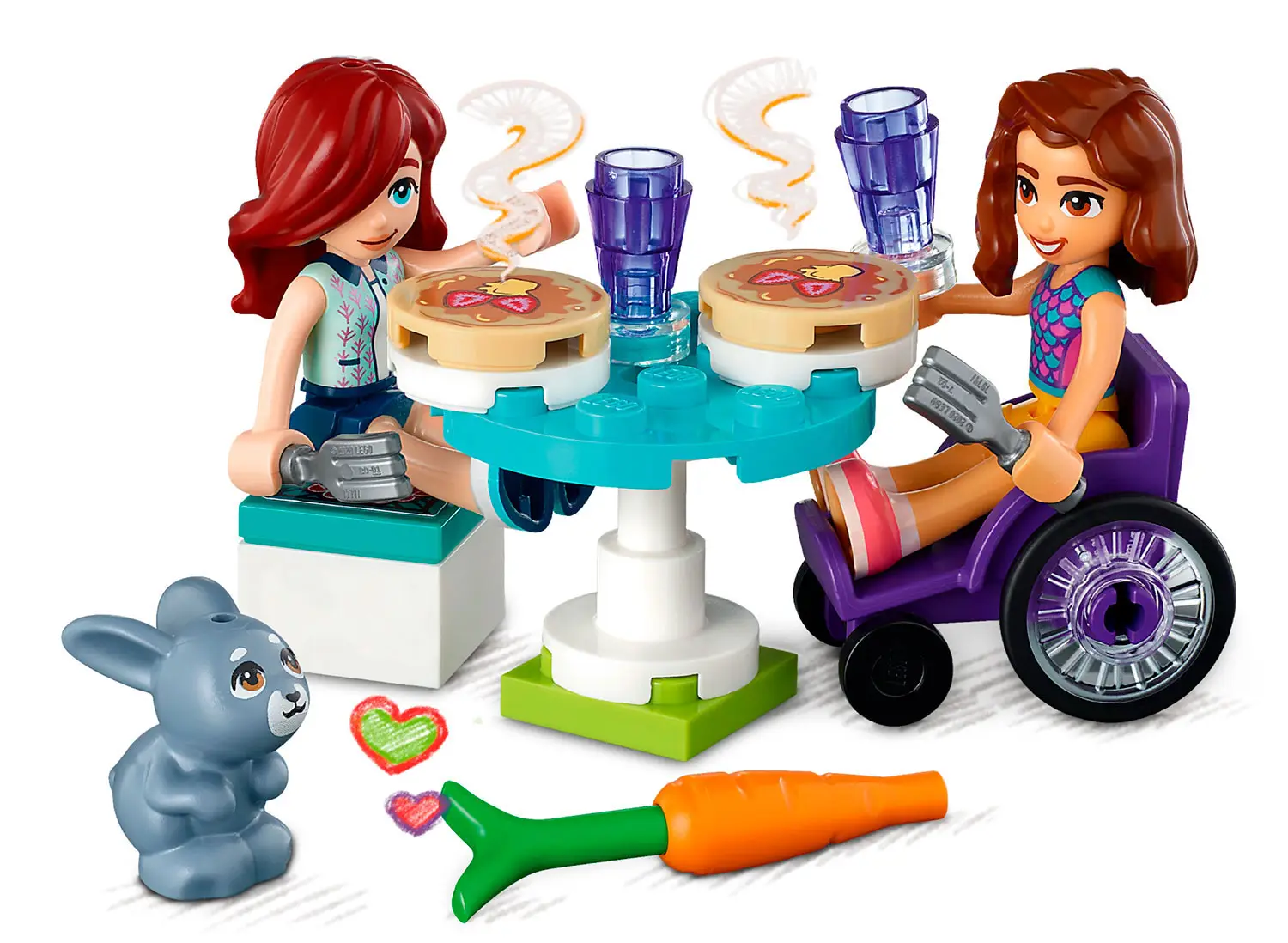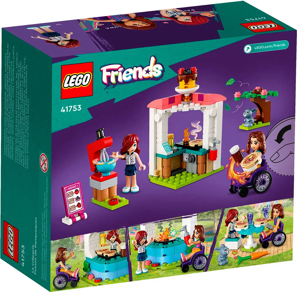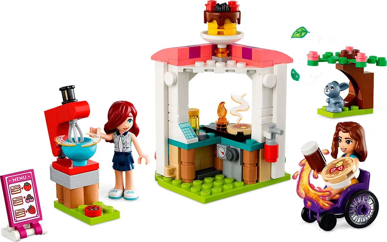 - в этот набор Lego Friends входят карта меню, 2 блина, банки из-под шоколада и меда, 2 вилки, 2 чашки, огнетушитель и миксер.