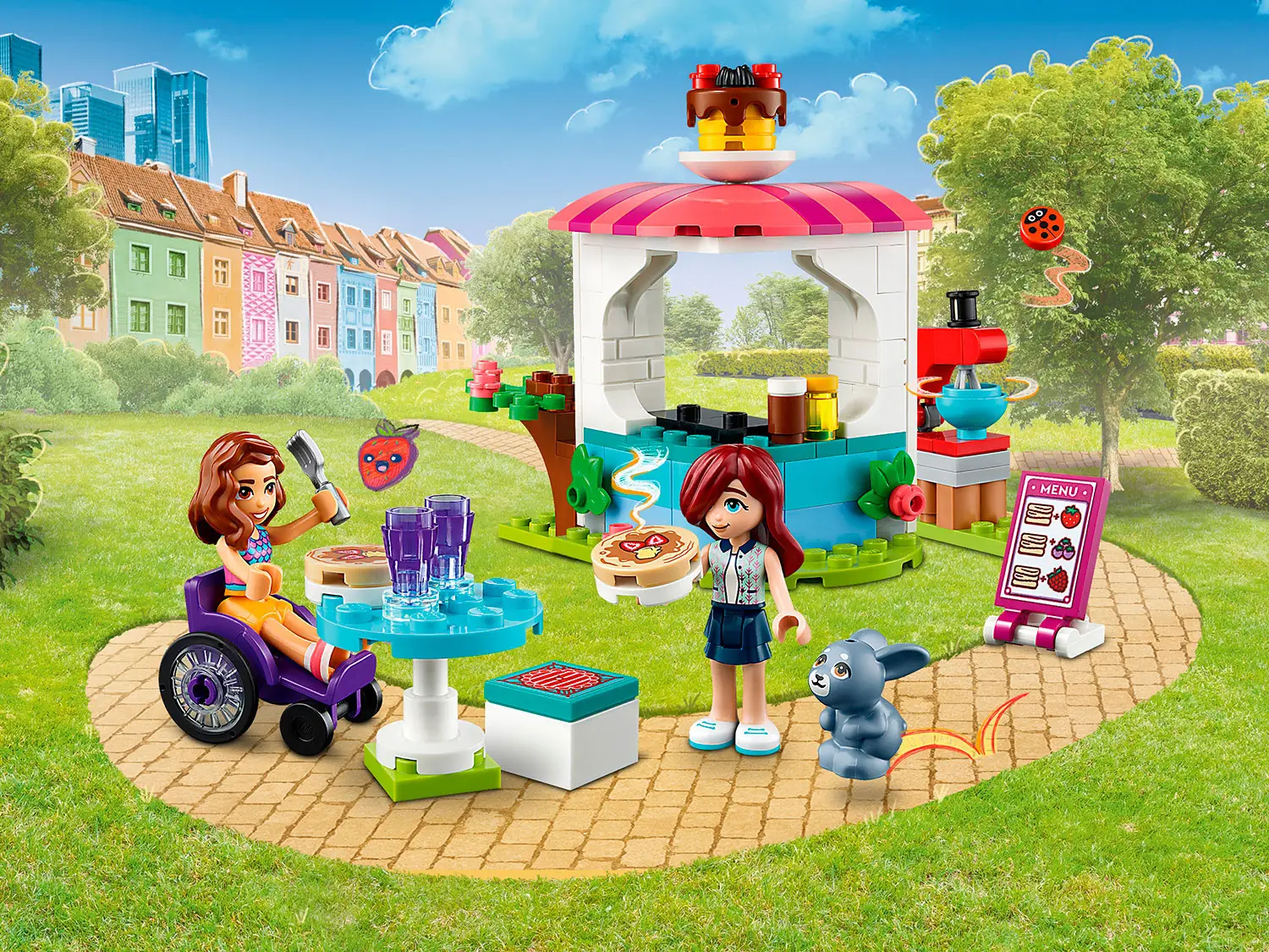 Набор Lego Friends приглашает вас в центральную закусочную. В игрушечной блинной лавке есть плита, начинки для блинов и миксер, который вращается, чтобы дети могли делать вид, что делают вкусные угощения. Также есть небольшой кассовый аппарат, стол и карта меню для разыгрывания историй с клиентами. Детям понравится наблюдать за кроликом, прячущимся под кустом.