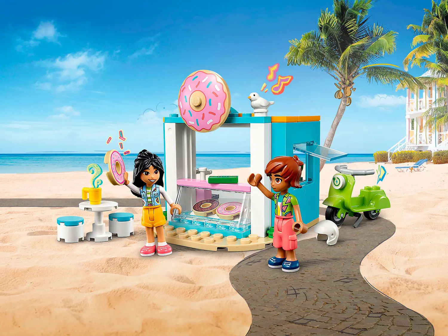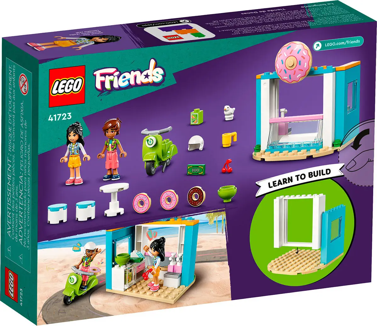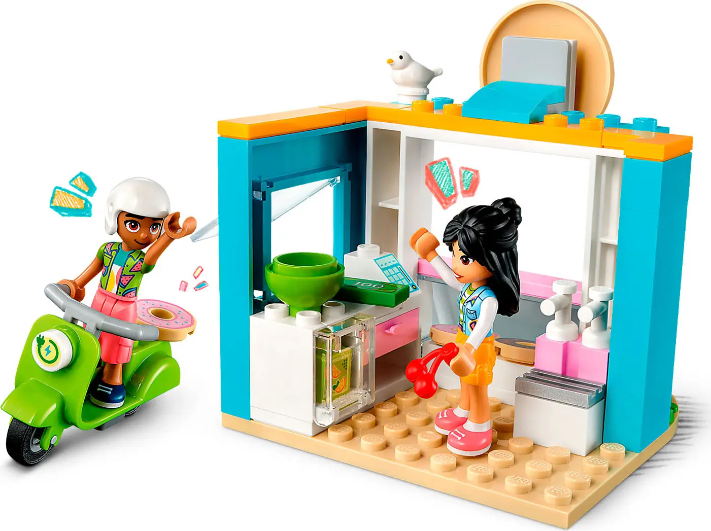 - в игрушечный набор входят персонажи Lego Friends Лианн и Лео, окно для выдачи угощений, а также аксессуары, включая скутер, птицу, пончики, сок, деньги, стол и 2 стула;