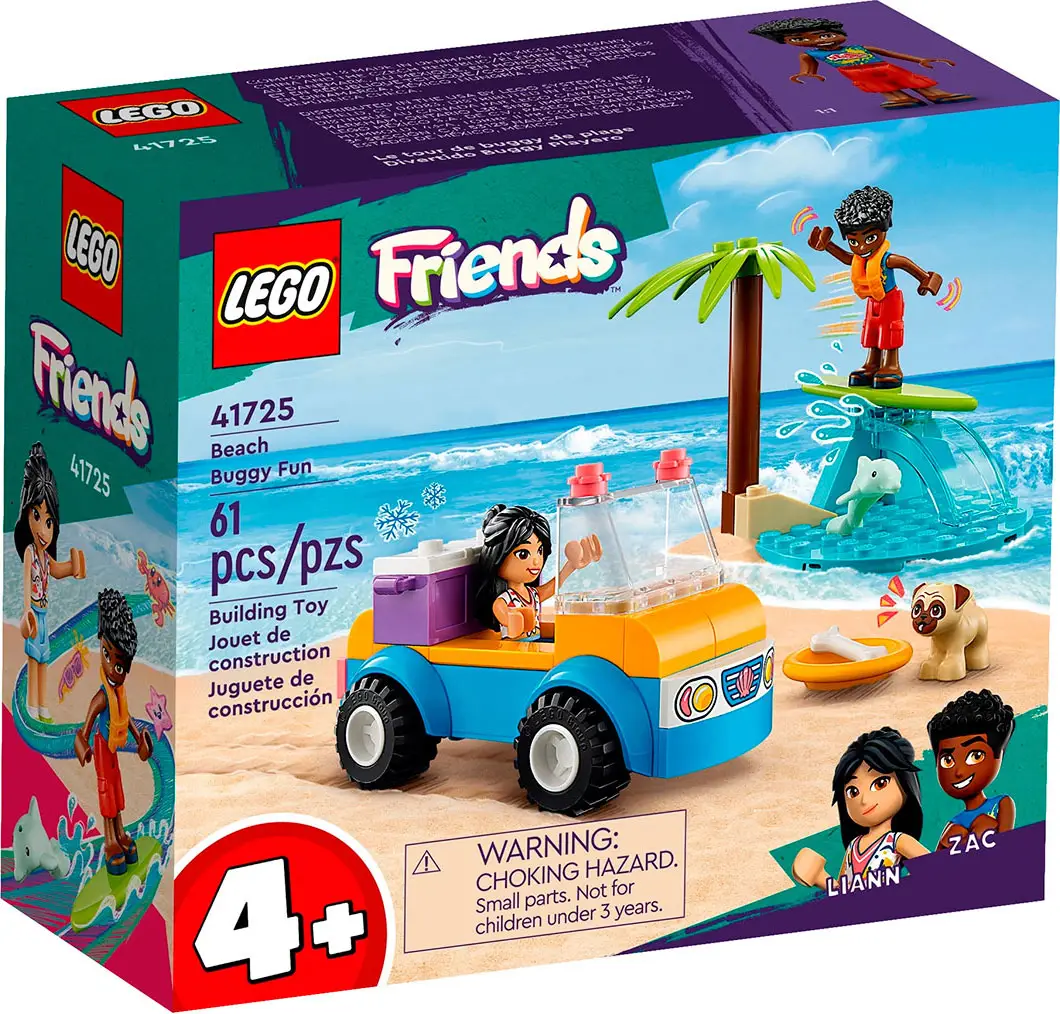 Конструктор Lego Friends – игрушечный набор помогает детям научиться строить, пока они занимаются творчеством с персонажами Лианн и Заком. Энергия и энтузиазм Лианн делают её отличной парой для общительного Зака. Аксессуары включают холодильник для еды с бананом и мороженым. В набор также входят игрушечный пляжный багги и волна, а также мопс и дельфин.