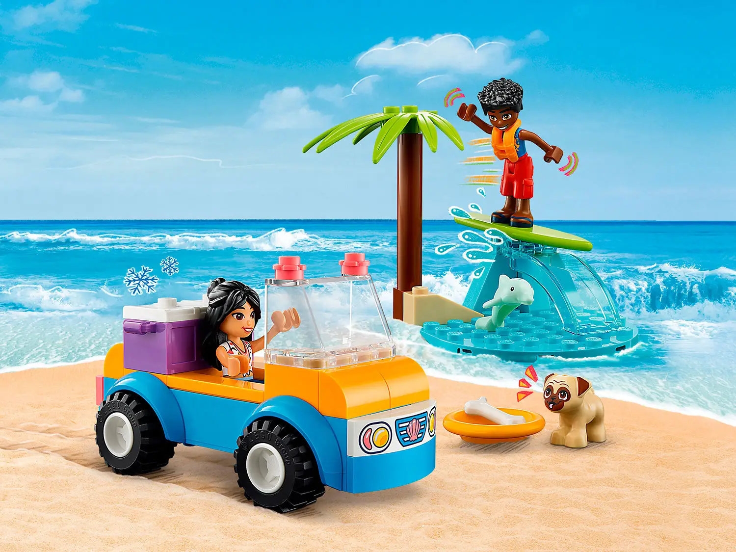 - в набор входят персонажи Lego Friends Лианн и Зак, домашний мопс, а также дельфин, игрушечный пляжный багги, охладитель и волна;
