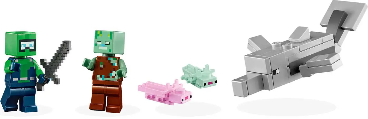 - включает в себя аутентичные фигурки Minecraft® – подводный исследователь, утонувший зомби, дельфин, рыба-фугу, 2 взрослых аксолотля и аксолотль в ведре.
