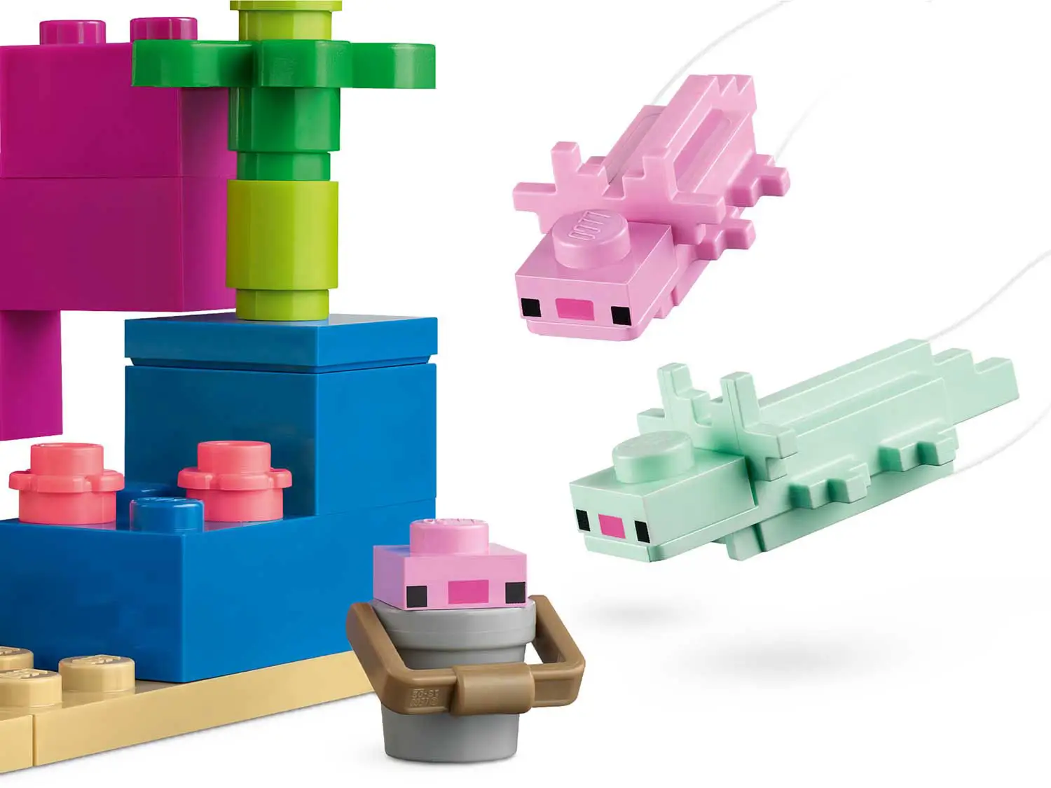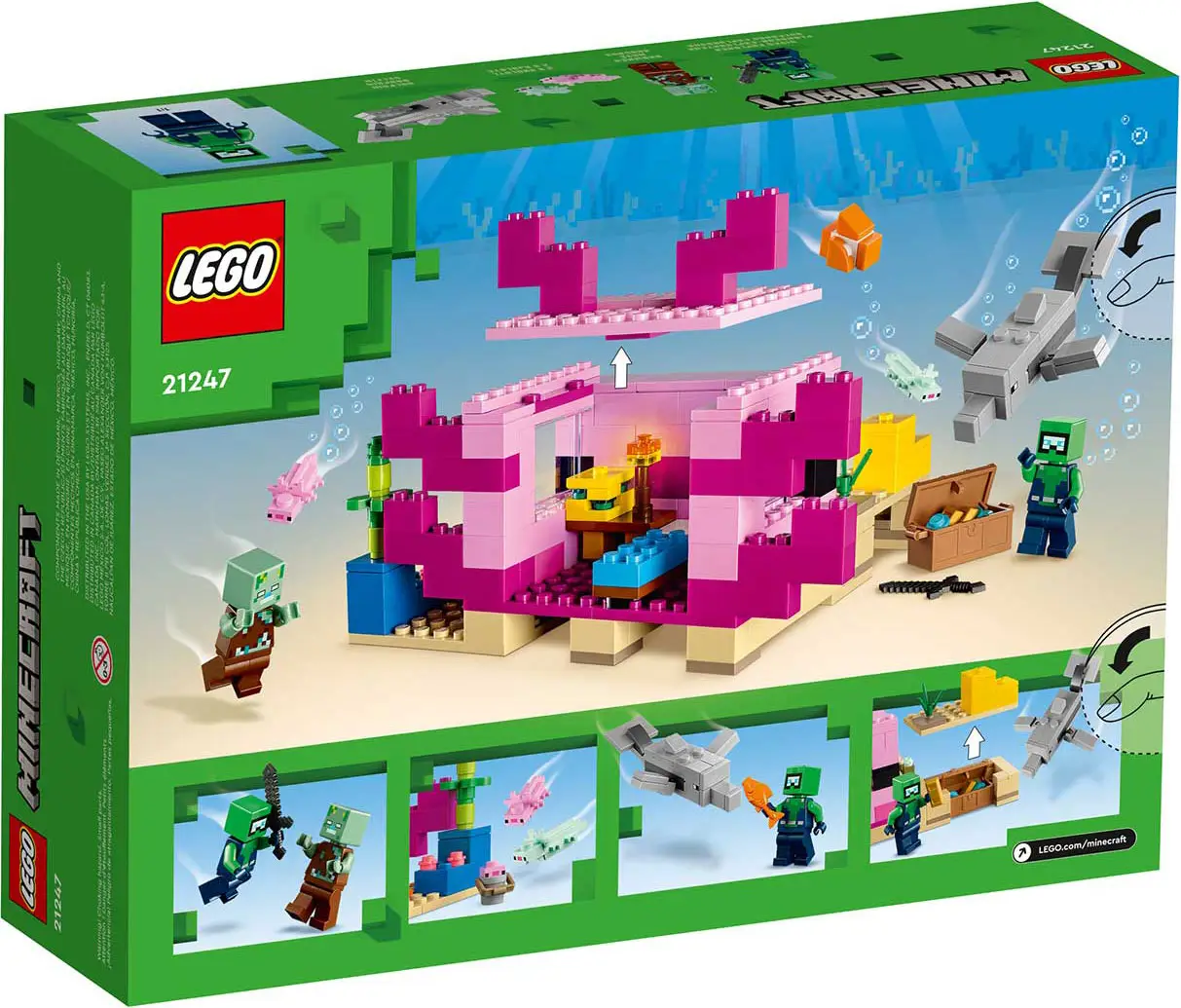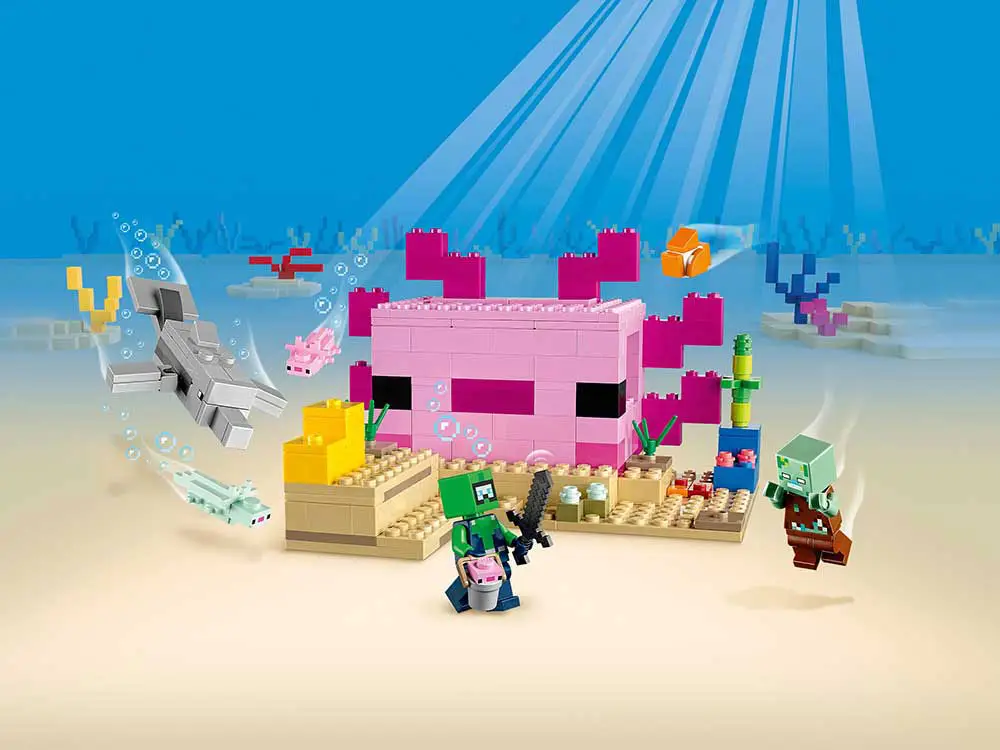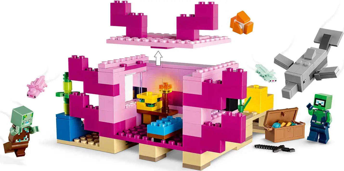 - Lego® Minecraft «Дом Аксолотля – это сборная подводная база с классическими функциями Minecraft и активностями как внутри, так и снаружи;