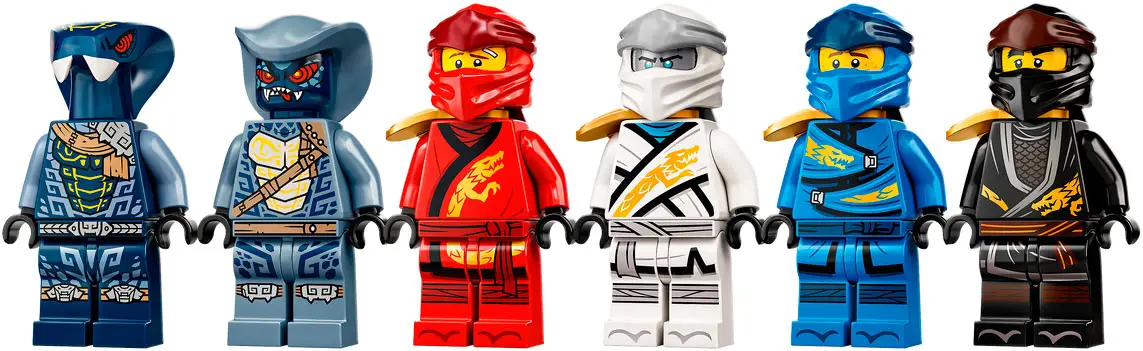 - в наборе 7 минифигурок – ниндзя Кай, Коул, Зейн, Джей и Зейн из серии «Наследие» готовы сразиться с воинами-змеями Раттлой и Мезмо из 1-го сезона телесериала Ninjago;