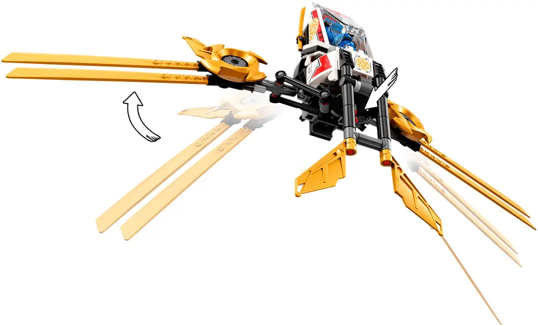 Разберите боевую машину и создайте самолет с золотыми крыльями-лезвиями, 2 вездехода и крутой мотоцикл, чтобы показать всю свою мощь ниндзя...