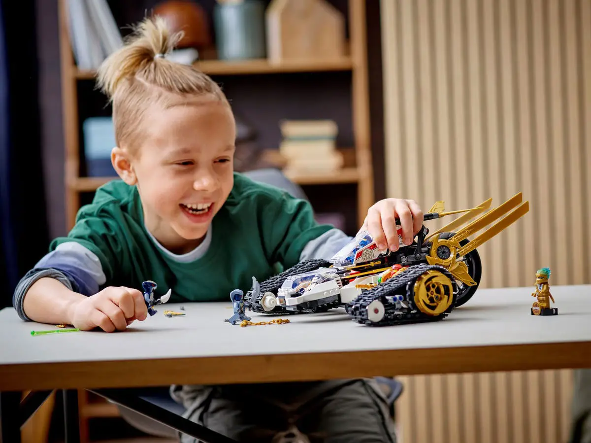 Разберите боевую машину и создайте самолет с золотыми крыльями-лезвиями, 2 вездехода и крутой мотоцикл, чтобы показать всю свою мощь ниндзя. Победите Раттлу и Мезмо, а потом выставьте золотую минифигурку «Наследие Зейна» из лимитированной серии напоказ, чтобы отметить 10-летний юбилей наборов Lego Ninjago.