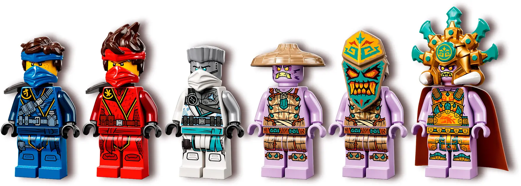 - в набор входят шесть мини-фигурок: Джей, Зейн, Кай, вождь Мамматус, Хранитель грохота и Хранитель грома. Все они, как и в сериале Lego Ninjago, вооружены для битвы;