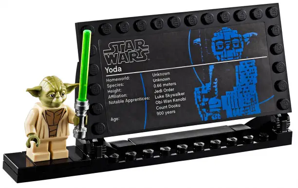 Модель продумана до мельчайших деталей, с подвижными головой, бровями, пальцами рук и ног, содержит также информационную табличку о Мастере-Джедае и стенд для включённой в комплект мини-фигурки Йоды со световым мечом.
