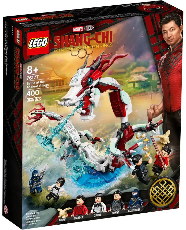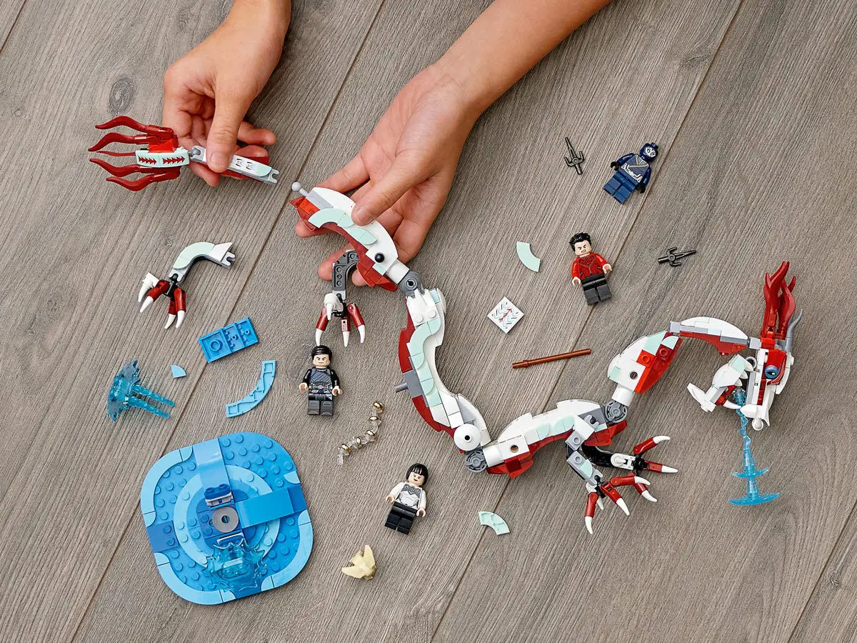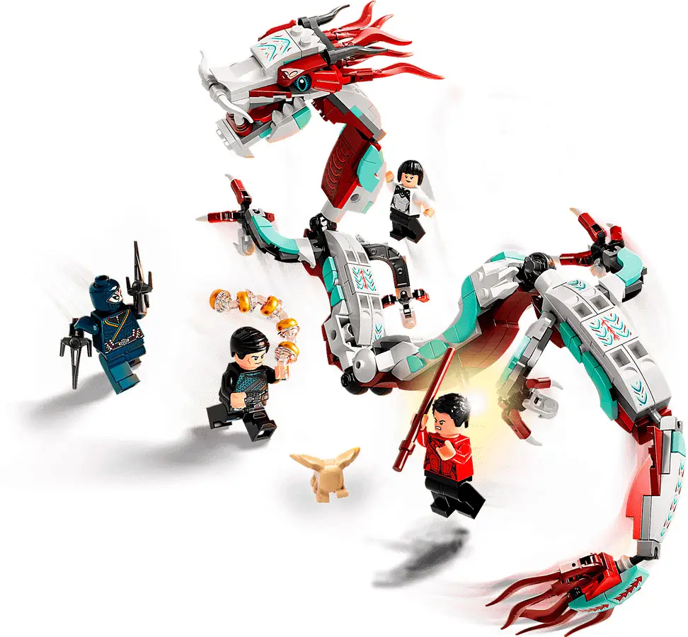 - содержит 4 минифигурки – Шан-Чи, Сялин, Вэнь-у и Несущего Смерть – и сборного сочлененного дракона со съемной водяной подставкой;