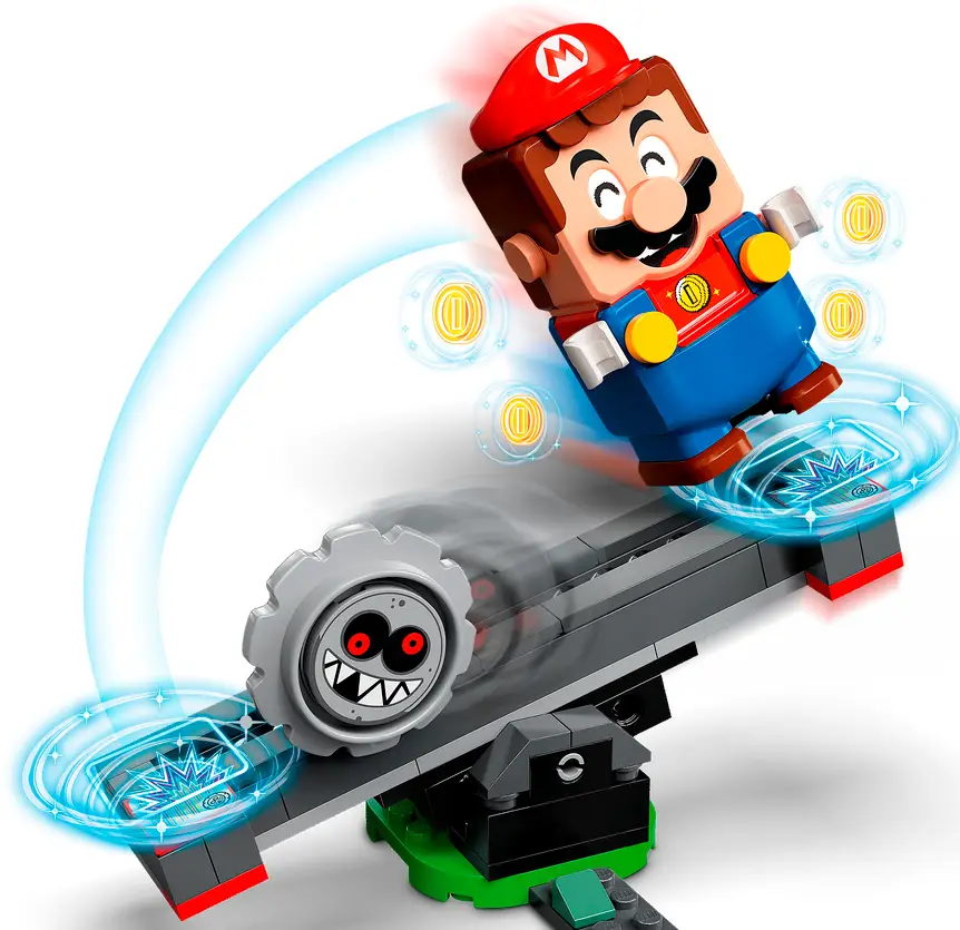 Добавьте этот увлекательный дополнительный набор к стартовому набору Lego Super Mario. Прыгайте на обоих концах качающегося шипоката, чтобы выиграть монеты. Крутите вращающиеся платформы и сбейте резноров с ног при помощи столба с шипами. Выиграйте награды из блока «?» и спасите синего Тоада. Объединитесь с другом, у которого есть фигурка Луиджи Lego или Марио Lego, или соревнуйтесь, кто быстрее соберет монеты, используя специальную скоростную трубу.