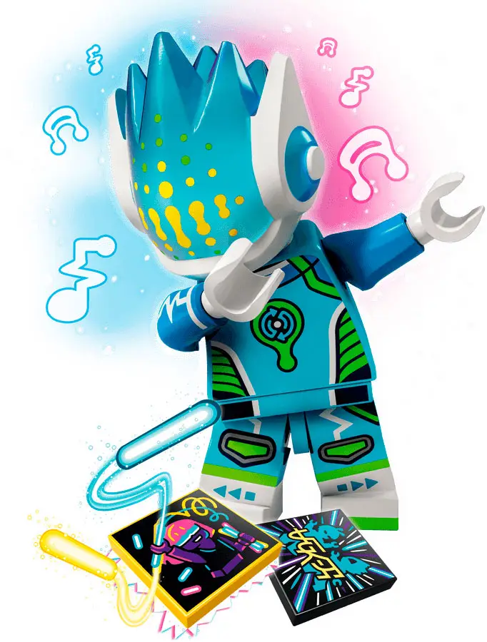 - набор включает минифигурку пришельца-диджея, аксессуар-пластинку, 14 случайных тайлов BeatBits и 2 эксклюзивных тайла BeatBits;