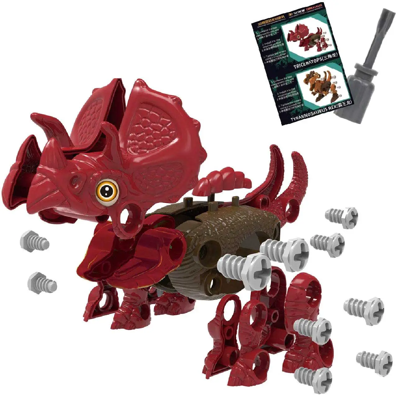 Внутри этого яйца спрятан красный динозаврик! Его можно разбирать и снова собирать с помощью отвертки, которая входит в состав набора, играть собранной фигуркой.