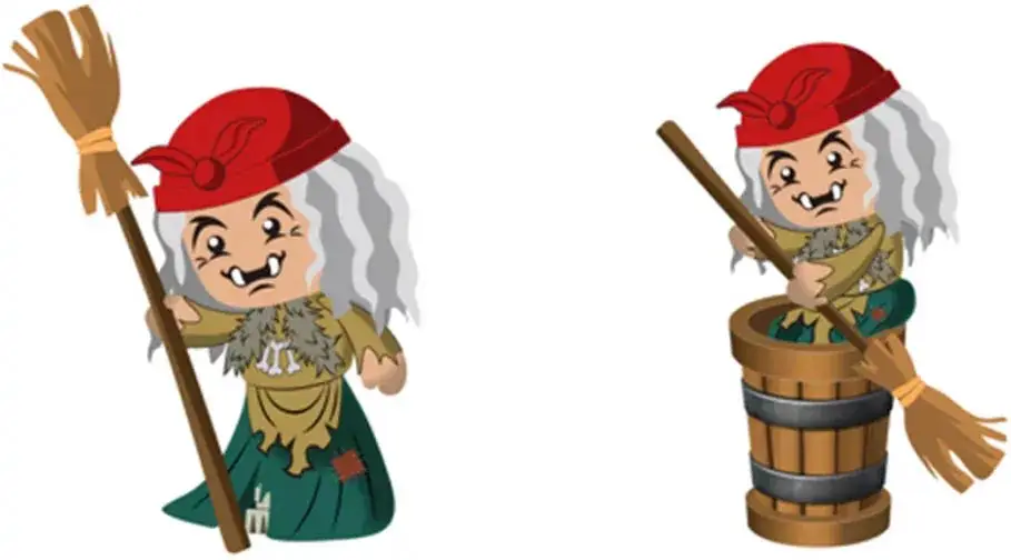 В этом наборе вы найдёте фигурки Бабы Яги с её ступой и метлой, чёрного кота и зелёной лягушки. Избушка открывается и закрывается. Внутри есть необычные предметы: пест, брёвна, мухомор и паутина с пауком.