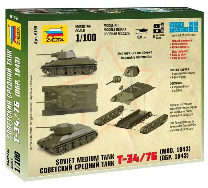 Сборная модель легендарного советского танка Т-34/76 обр. 1943 года в масштабе 1/100. Благодаря использованию при разработке модели трехмерных технологий, очертания оригинала в точности воспроизведены в миниатюре. Детали модели рассчитаны таким образом, чтобы максимально упростить процедуру сборки. При этом, для сборки модели не требуется клей - детали отлично стыкуются "на щелчок". Вы сможете не только пополнить этой моделью вашу коллекцию миниатюрной бронетехники, но и использовать ее в настольной военно-тактической игре "Великая Отечественная". На игровом поле данная модель отображает подразделение советских танков.