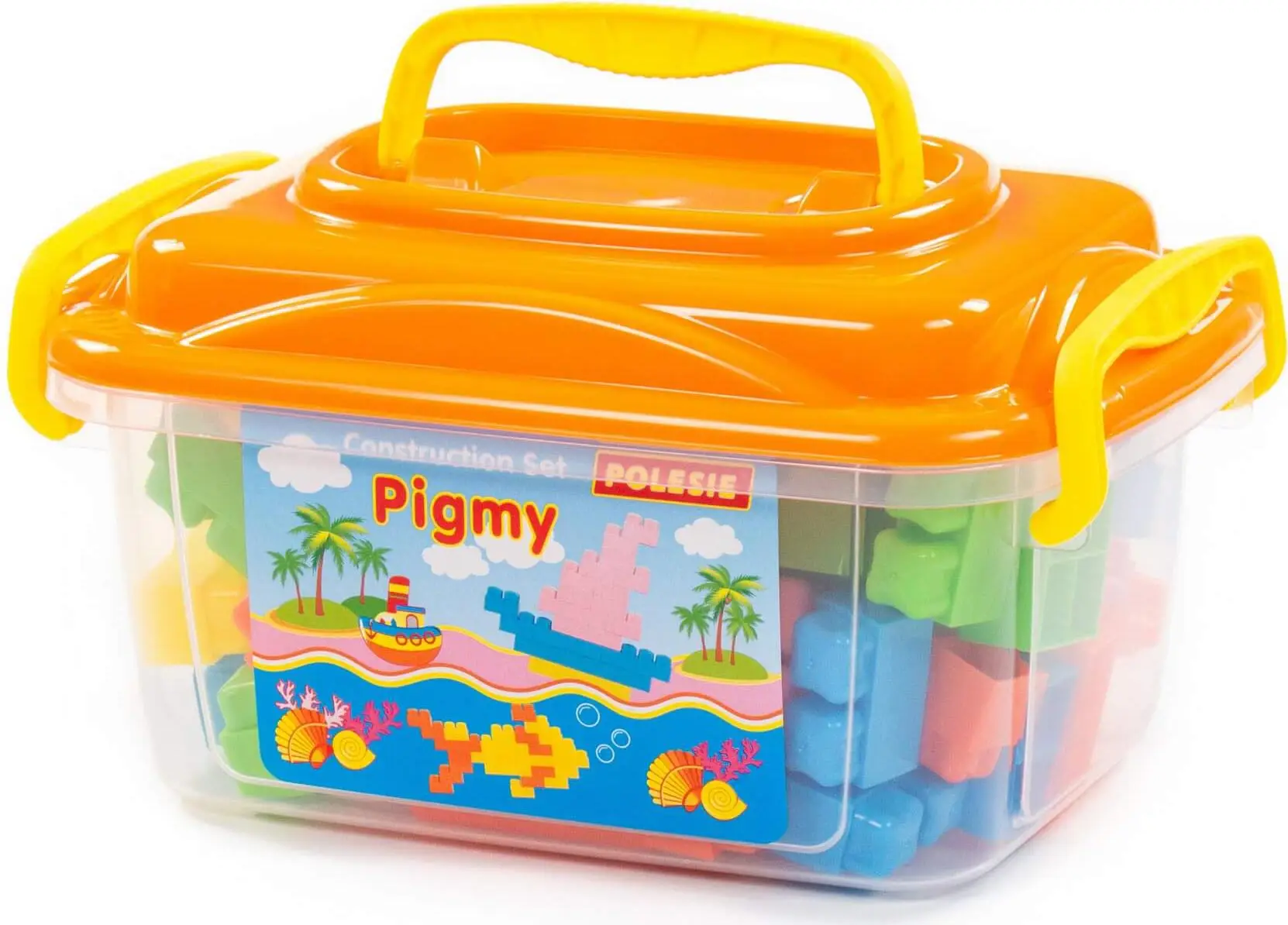 Все детали компактно упакованы в контейнер с ручками, что удобно для хранения и перемещения конструктора.