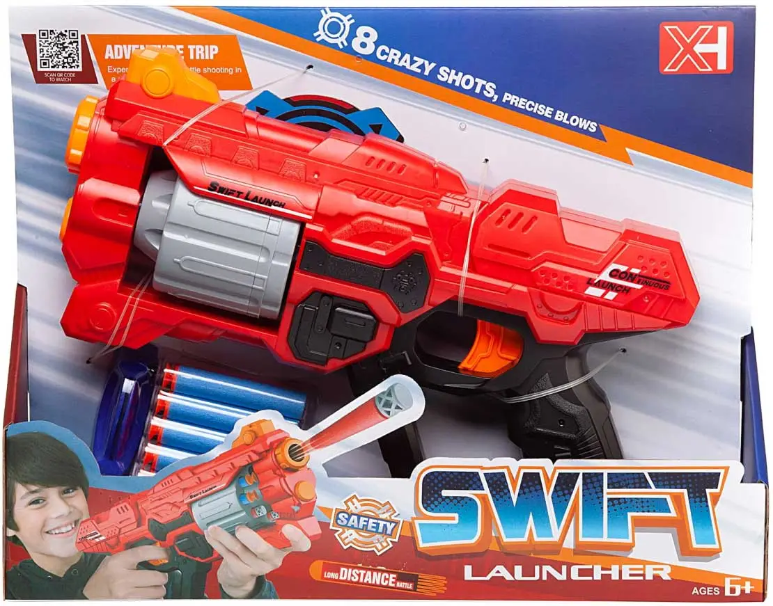 Бластер стреляет мягкими пулями с безопасным наконечником. Он имеет яркий, привлекательный, футуристический дизайн, его удобно держать в руках. Подряд из бластера можно сделать 8 выстрелов. Для этого нужно загрузить в барабан 8 пуль и, оттягивая затвор каждый раз перед выстрелом, нажимать на курок. В процессе игры с бластером ребенок будет тренировать меткость, развивать ловкость и воображение.