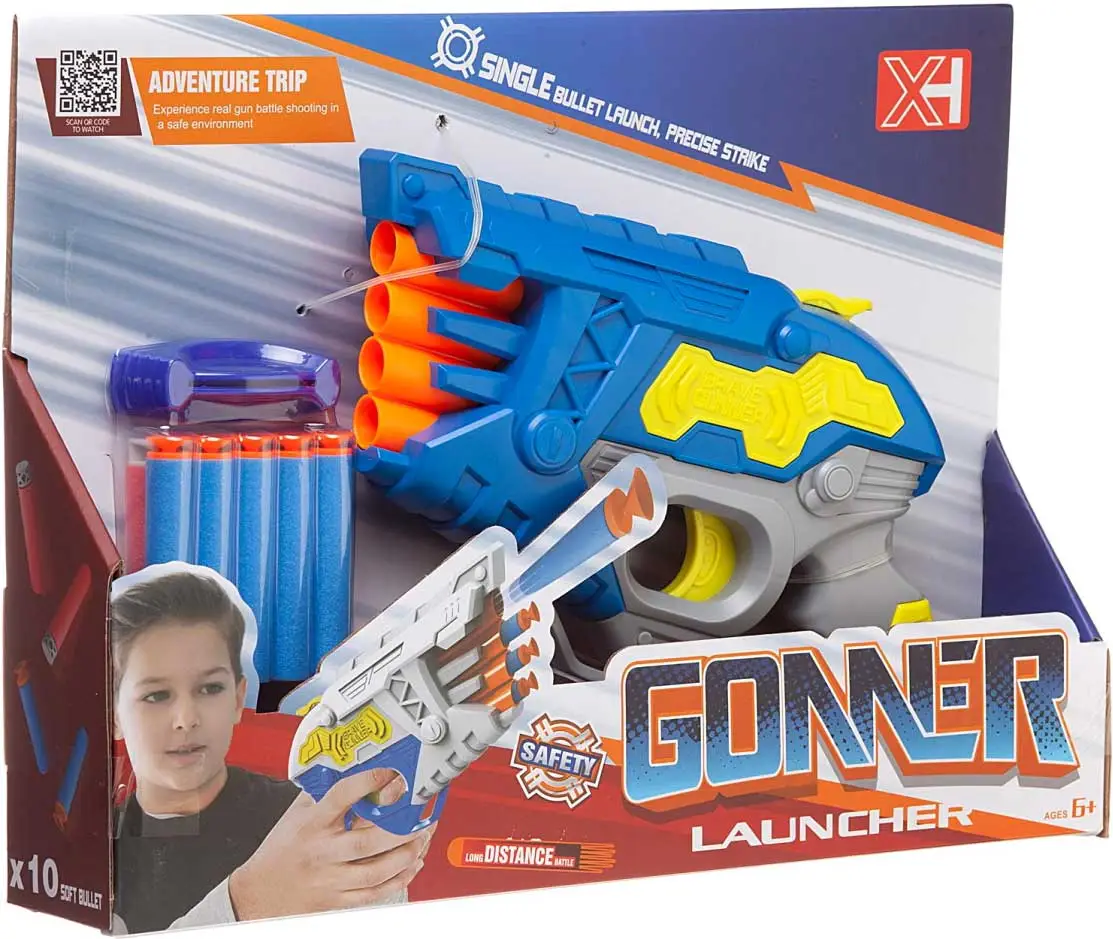 Бластер стреляет мягкими пулями с безопасным наконечником. Он имеет яркий, привлекательный, футуристический дизайн, его удобно держать в руках. В процессе игры с ним ребенок будет тренировать меткость, развивать ловкость и воображение.