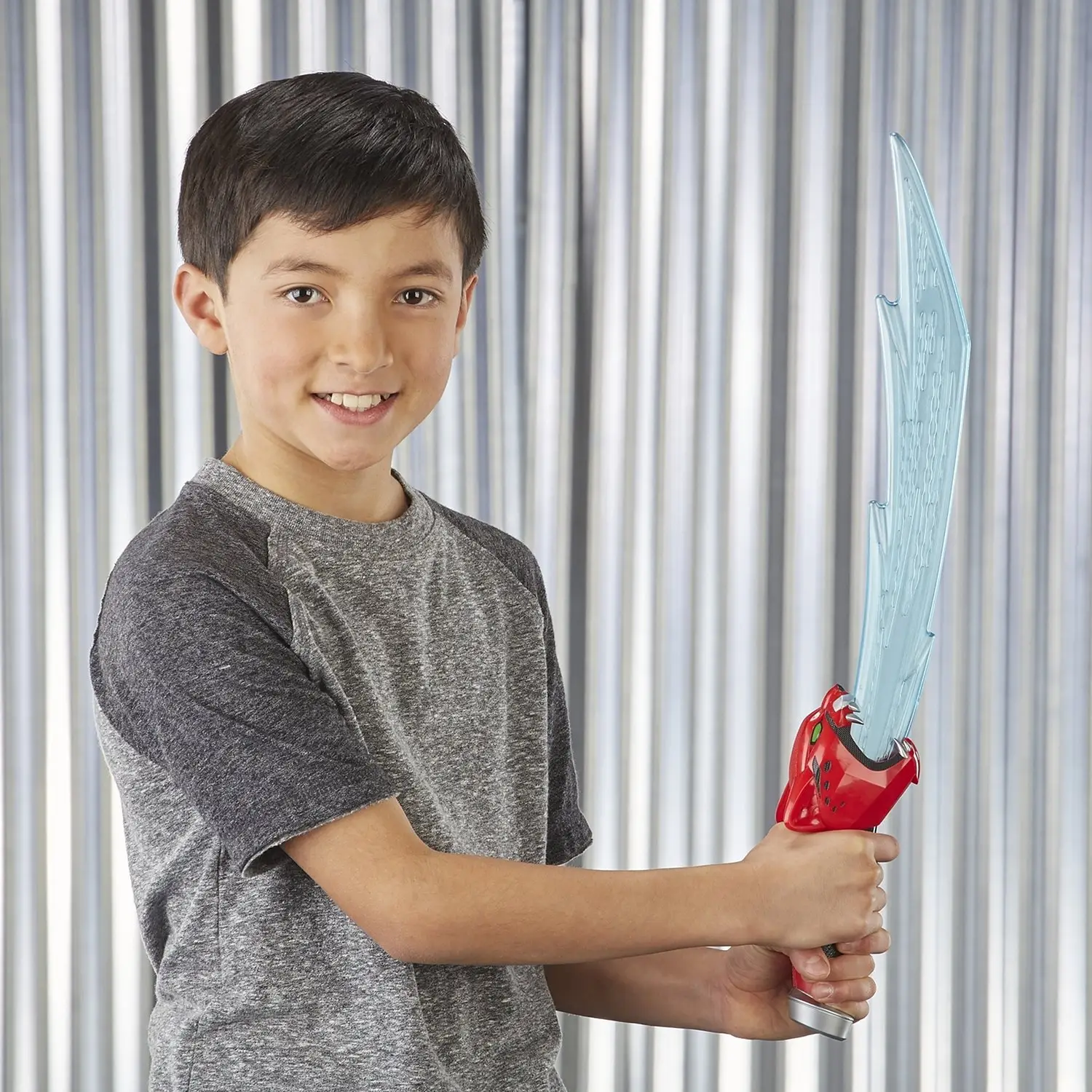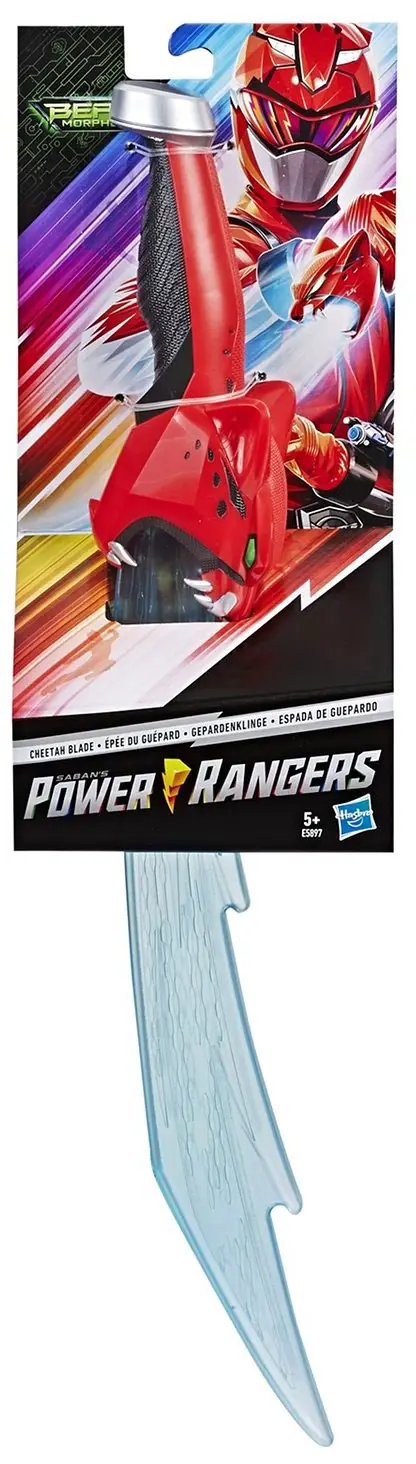 Меч Красного Рейнджера выглядит очень реалистично. Прозрачное пластиковое лезвие голубого цвета крепится к причудливой рукояти в виде гепард...