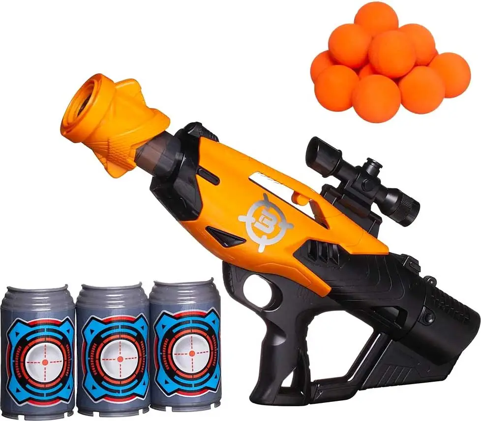- комплектность – бластер, мягкие шарики – 12 шт, банка-мишень – 3 шт;