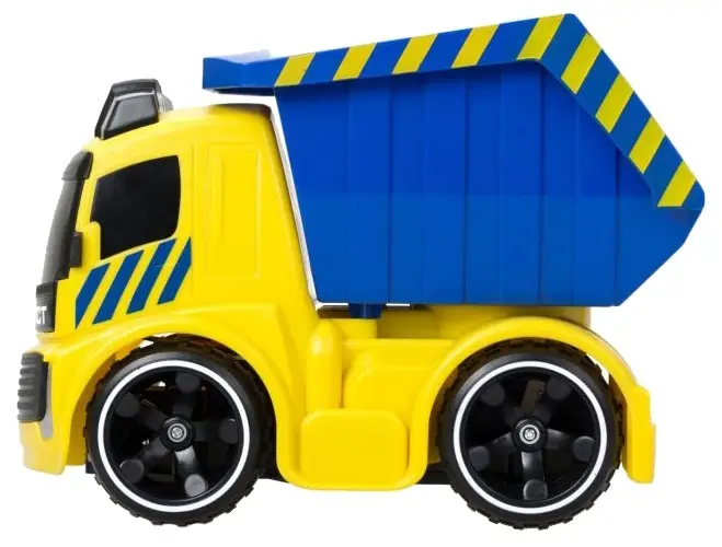 - машинка имеет ярко-желтую кабину и синий кузов со специализированными надписями;