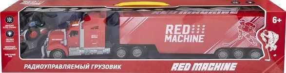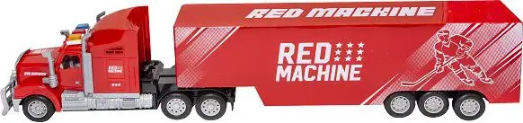 На крыше кабины водителя имеется подсветка в виде лампы. Прицеп можно отсоединить. В комплекте пульт в виде руля, с помощью которого машина управляется во время движения и активации световых эффектов. Дизайн красного цвета, на прицепе фирменные знаки хоккейной команды Red machine.
