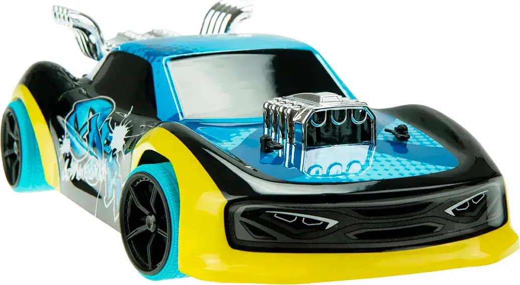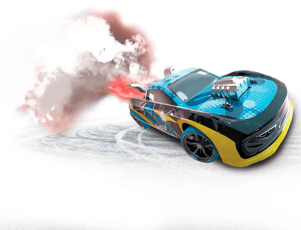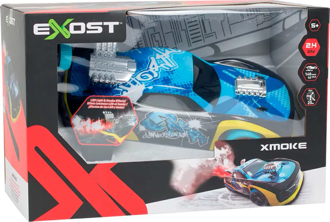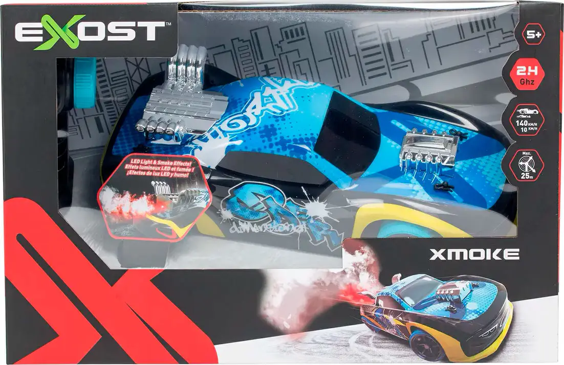 Exost Икс Смоук – радиоуправляемая модель гоночного спорткара. Радиоуправление 2.4G позволяет не перебивать сигнал с другими машинами. Машинка оснащена системой эффекта дыма которая включается во время движения автомобиля.