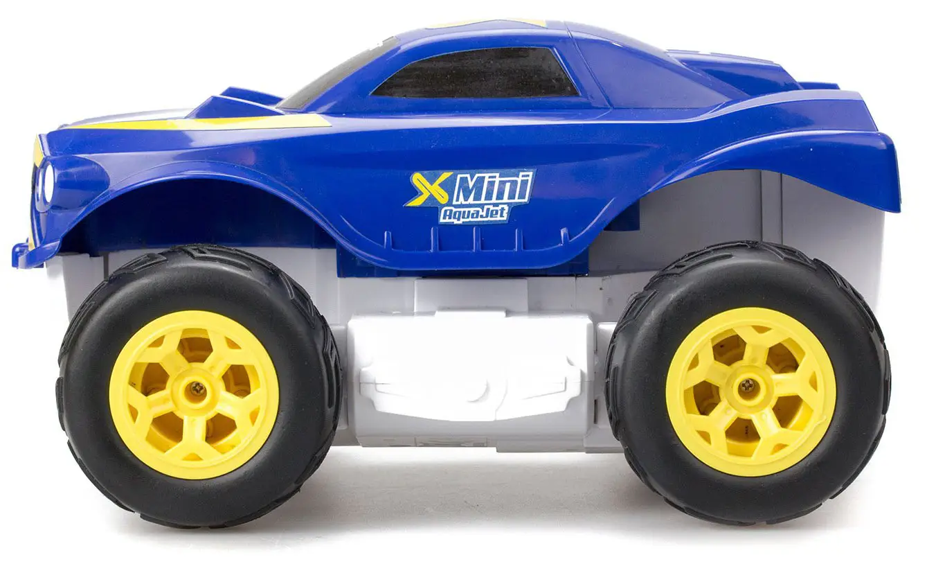 - у игрушки четырёхколёсное шасси, которое складывается при нажатии на кнопку и превращает автомобиль в катер;