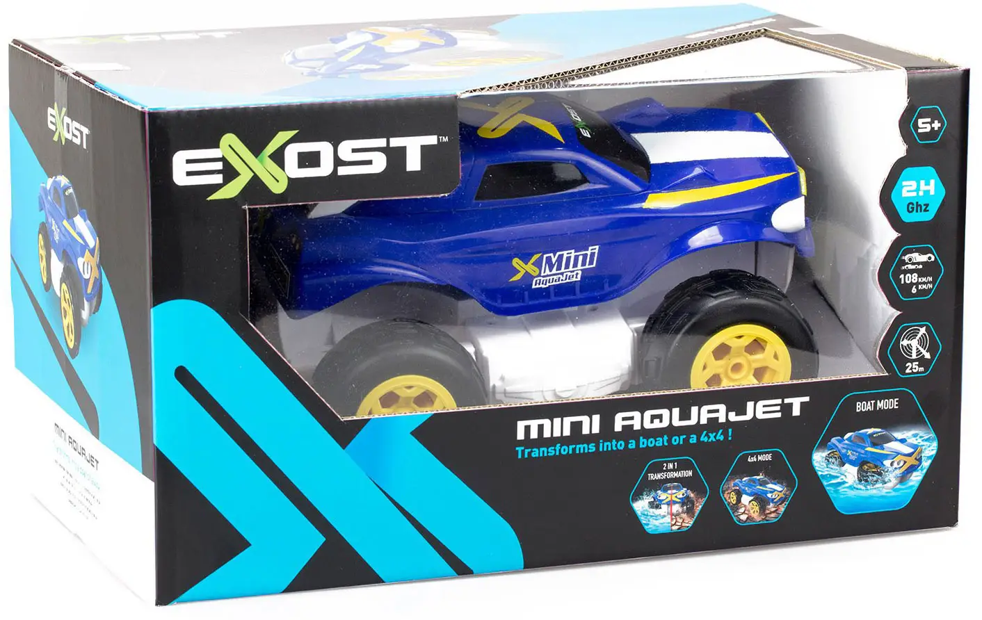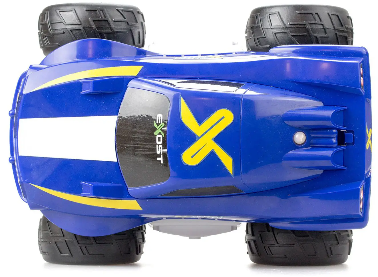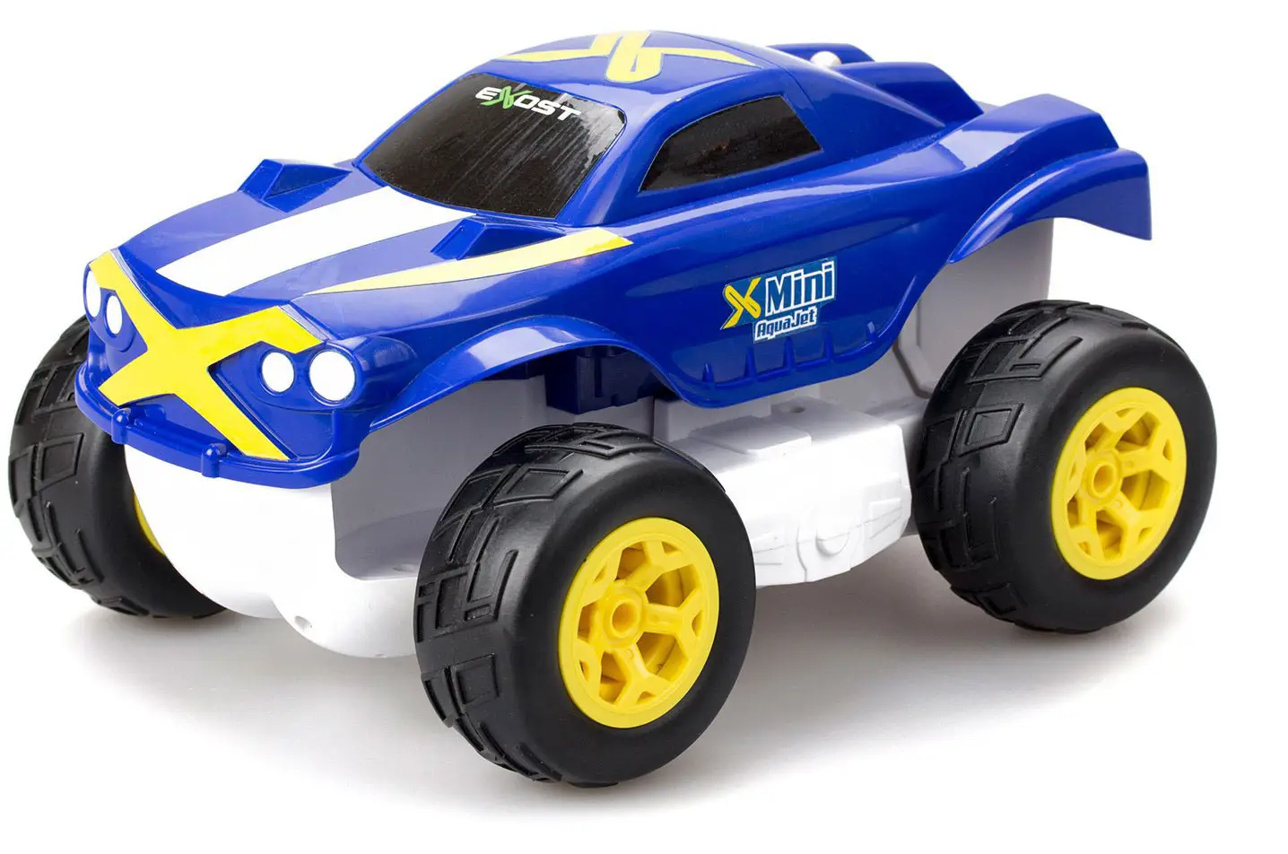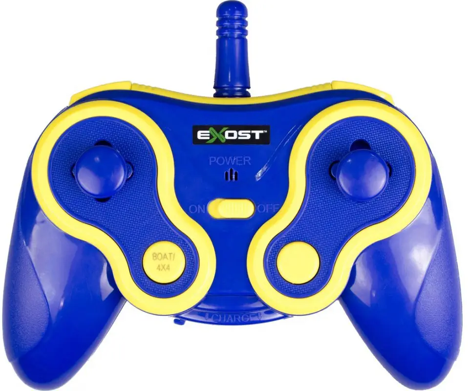 Игрушка Exost представляет собой машину-амфибию с эффектным синим кузовом с белыми полосами на капоте.