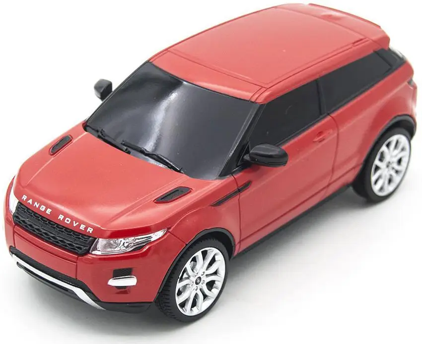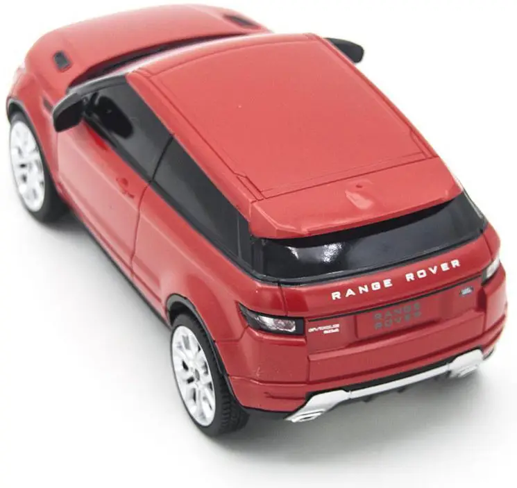 Игрушка напоминает автомобиль Range Rover Evoque с детализированным кузовом, окрашенным в яркий красный цвет.