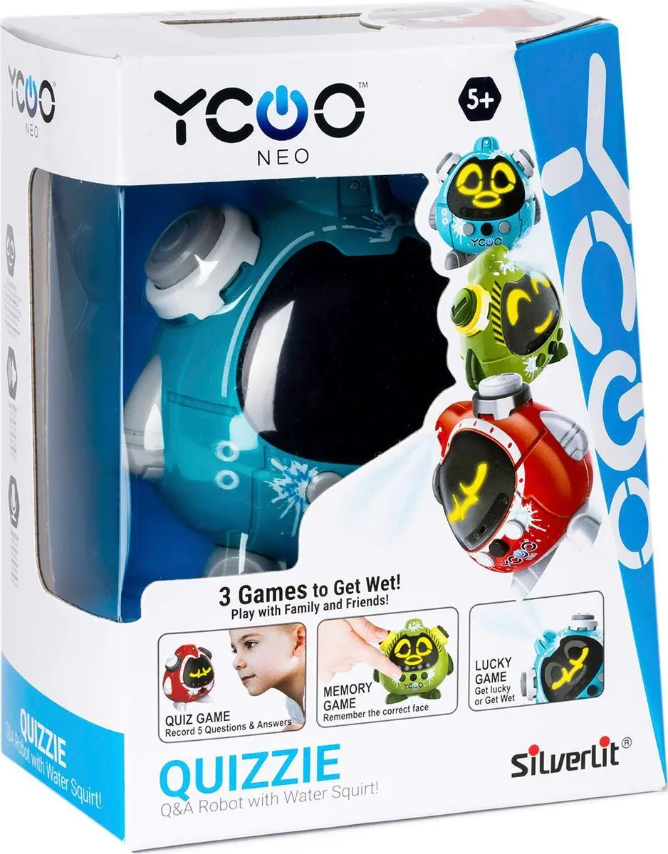 Лотерея. При нажатии специальной кнопки Квизи быстро начнёт менять выражение лица с весёлого на грустное и обратно. Если робот остановится на радостном лице, то можно продолжать игру. Если Квизи замрёт со злым выражением, то порция воды вам обеспечена.