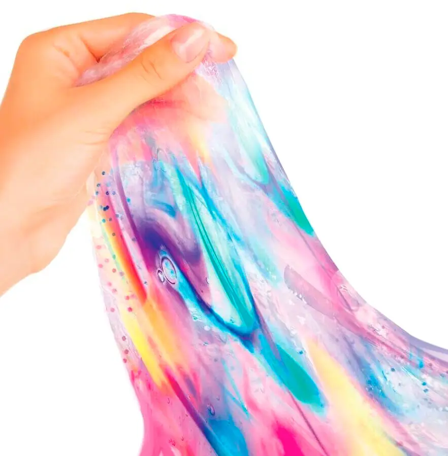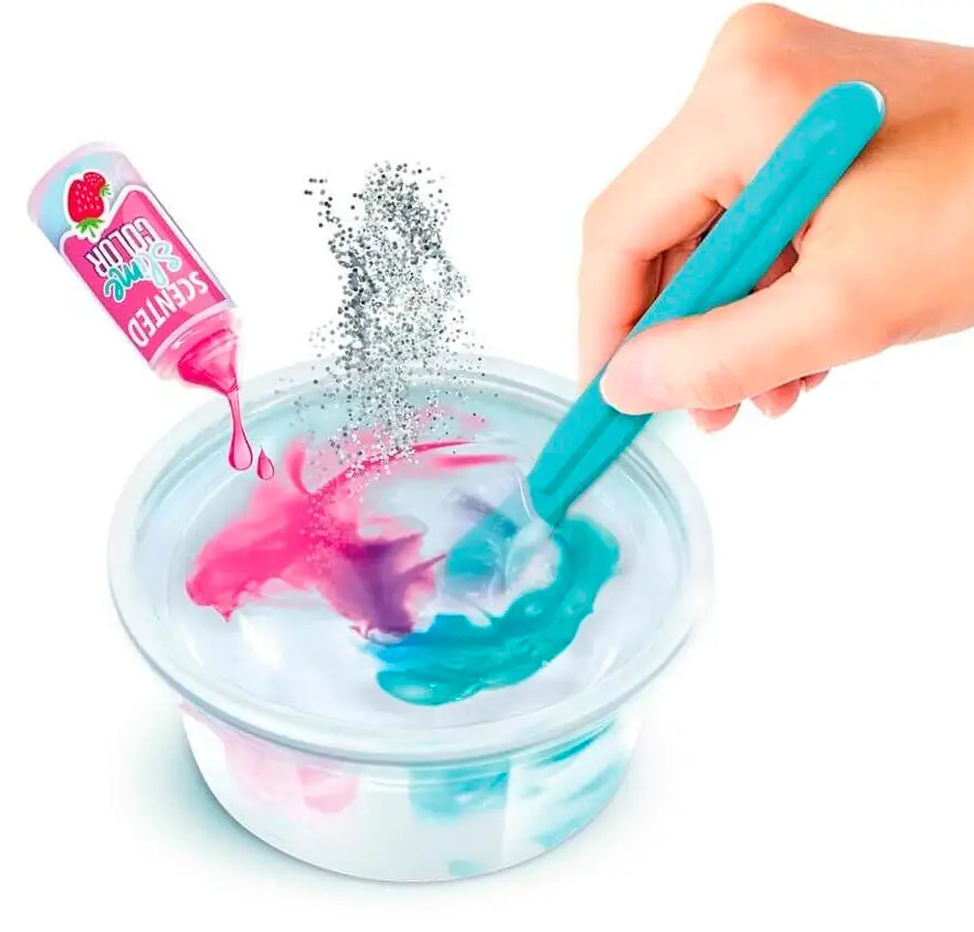 Ребёнку предстоит раскрасить уже готовый прозрачный слайм, смешивая цвета и используя свое воображение. В наборе также присутствуют элементы для декорирования слайма и детали, позволяющие разыграть сценку из повседневной жизни.