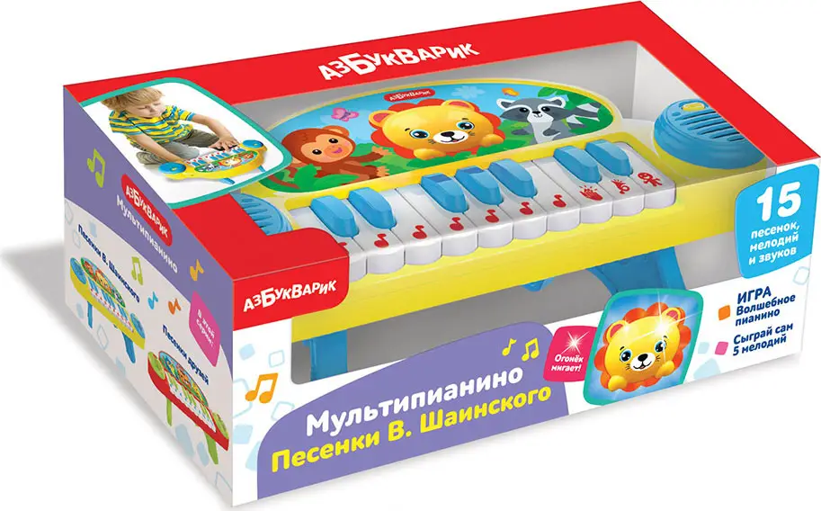 Мультипианино от компании Азбукварик украшено яркими наклейками с любимыми героями песен, а главный персонаж в центре порадует малыша весёлыми огоньками, которые мигают под музыку. У игрушки есть удобная подставка в виде трёх ножек.