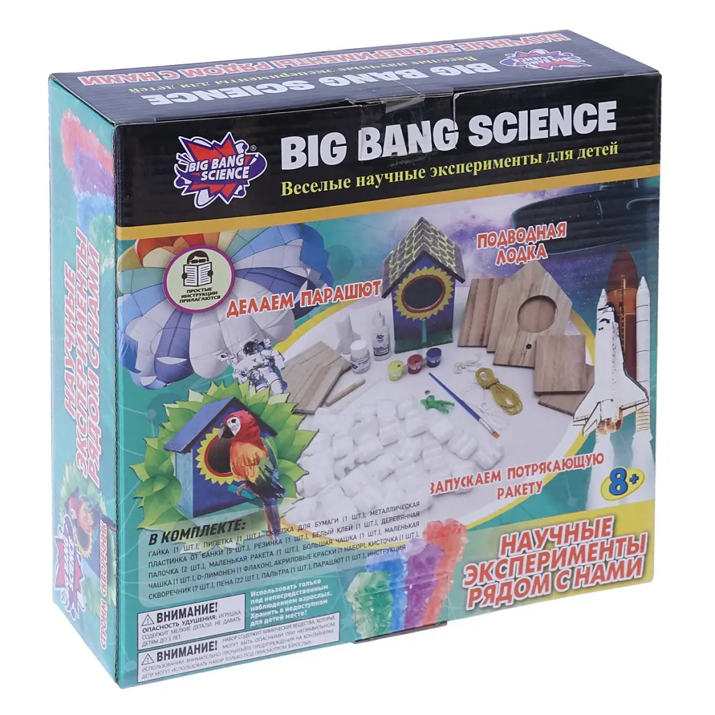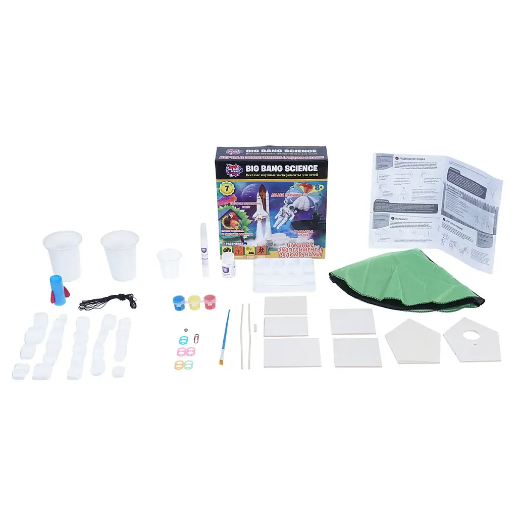Набор предлагает поучавствовать в запуске ракеты или подводной лодки, сделать парашют и много-много другого.