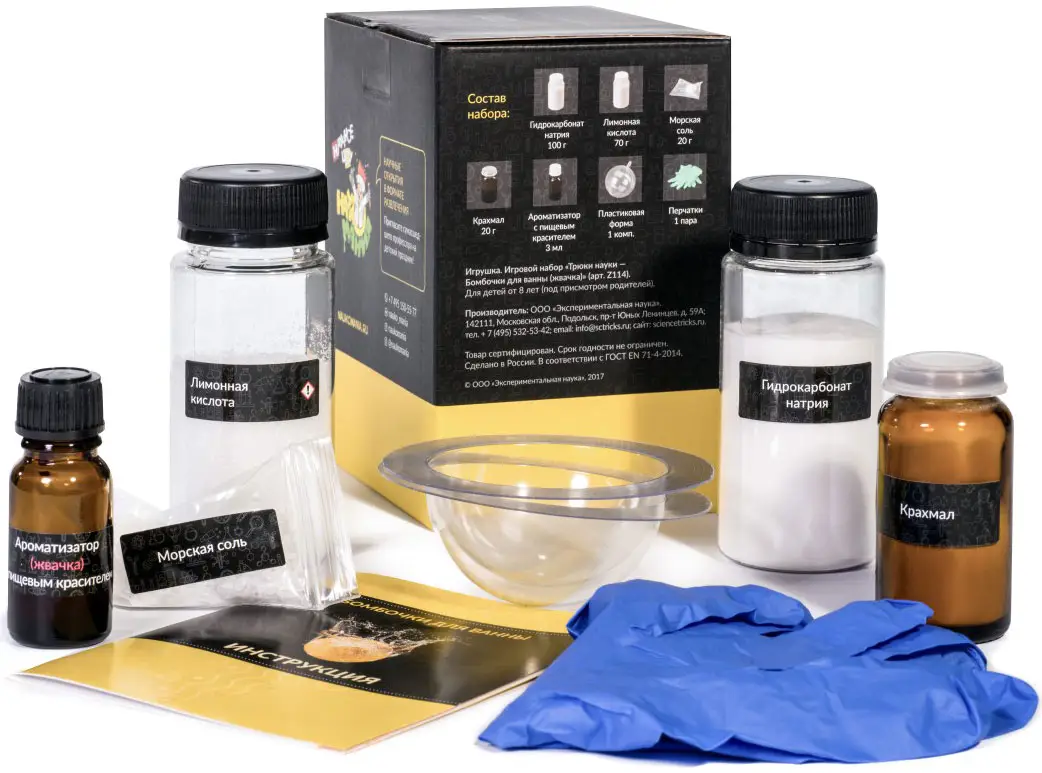 Набор Бомбочки для ванны от компании Трюки науки подарит ребёнку возможность провести удивительный эксперимент в домашних условиях и создать ароматные шипучие шарики для ванны.