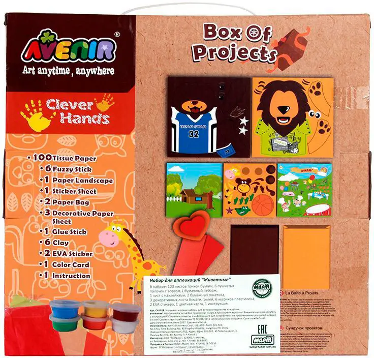 Наполнять листы из этого набора аппликациями крохи будут с помощью ярких стикеров, вырезанных деталей, пушистых проволочек и даже пластилина, представленных в 6 насыщенных оттенках.