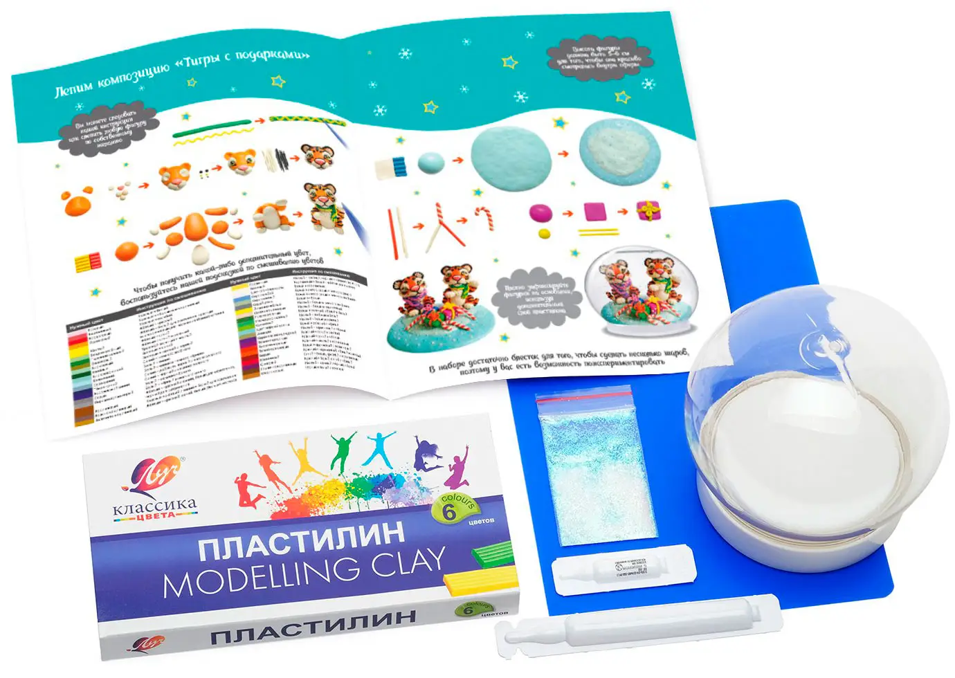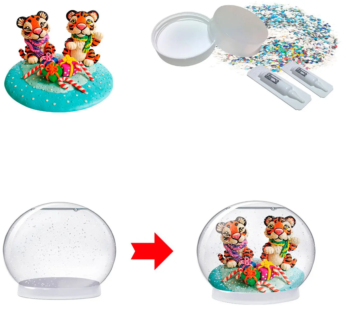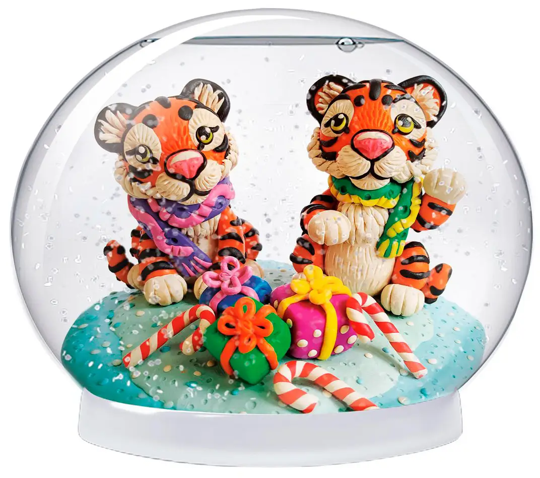 В наборе предусмотрено все необходимое, чтобы сделать такую волшебную сказку. Слепите композицию из пластилина, следуя инструкции, и прикрепите ее к подставке. Добавьте в сферу воду, блестки и специальные жидкости. И в конце аккуратно соедините обе части шара. Подарок готов! При желании вы можете слепить свой собственный сюжет. Рекомендуем сверять высоту фигурок и сферы, чтобы композиция смотрелась эффектнее в итоговой сборке.