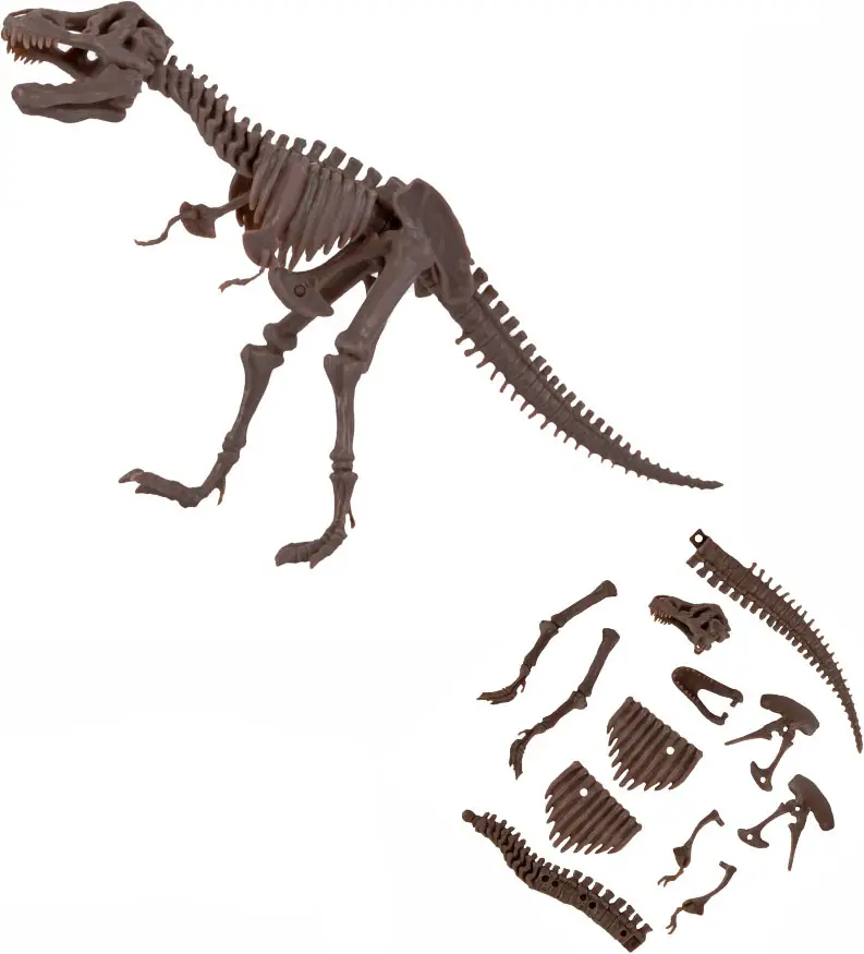 В коробке находится гипсовый брикет и археологические инструменты: молоточек со скребком, зубило и кисточку. С помощью инструментов ребёнок отыщет в брикете кости легендарного тираннозавра, а затем аккуратно соберет весь скелет, скрепив его мягким воском.