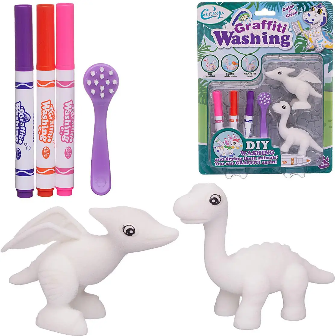Набор для творчества Junfa, фигурки для раскраски, динозаврики, 2 фигурки, 3 фломастера, фиолетовая щетка