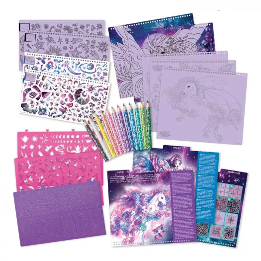 Раскраска для девочек от Nebulous Stars – скетчбук на пружине с эскизами. Создание яркой коллекции рисунков с помощью цветных карандашейв. К набору прилагается подробная инструкция и буклет с историей единорогов.