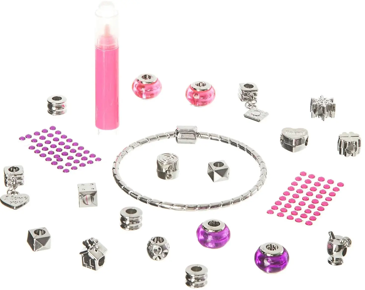 В набор входит 19 элементов: 1 браслет, 2 цветные бусины, 2 подвески, 14 бусин-чармов.
